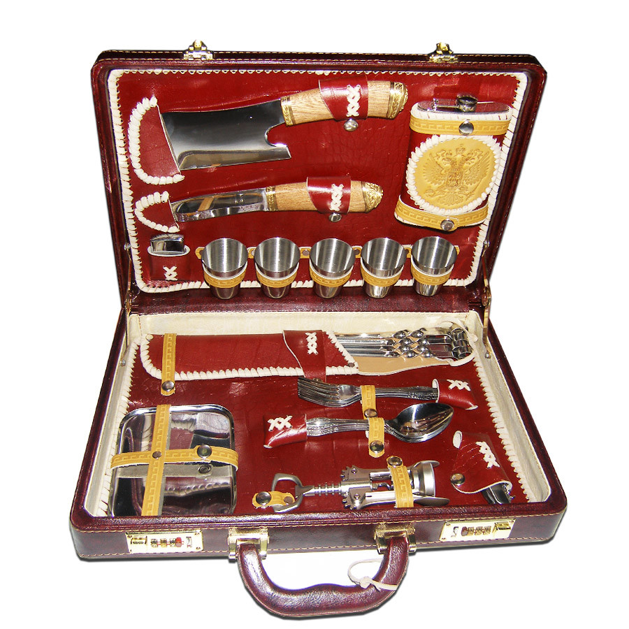 Удлиненный кейс выполнен из кожзама, внутренняя отделка из натуральной кожи песочного цвета. Металлические части изделия выполнены из нержавеющей стали.