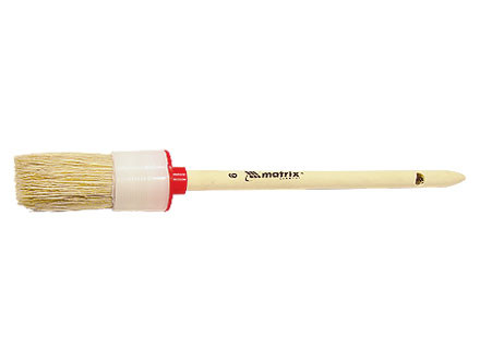 Ворс кисти из натуральной светлой щетины, расщепленной на концах. Кисть конической формы имеет разную длину щетины, что обеспечивает более точное выполнение работ. Щетина кисти надежно закреплена металлическим бандажом с антикоррозийным покрытием. Трехкомпонентная эргономичная обрезиненная ручка не скользит в руке и имеет отверстие для подвешивания. Кисть предназначена для работ с масляными красками и лаками, устойчива к агрессивным составам.
