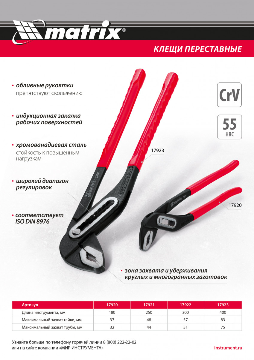 Клещи переставные 180 мм, хром-ванадий, обливные рукоятки Matrix