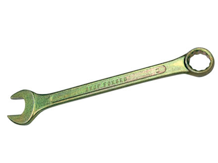 Ключ изготовлен из хромванадиевой стали. Твердость материала рабочей части ключа 45 HRc (требования ГОСТ – 45–51 HRc). Ключ имеет полированное хромоникелевое покрытие. Профиль кольцевого зева имеет 12 граней, что увеличивает площадь соприкосновения рабочих поверхностей и снижает риск деформации граней крепежа при монтаже. Угол наклона кольцевого зева относительно плоскости ключа в 15 градусов делает монтаж более удобным. Ключ гаечный комбинированный с открытым и кольцевым зевом предназначен для монтажа демонтажа резьбовых соединений.