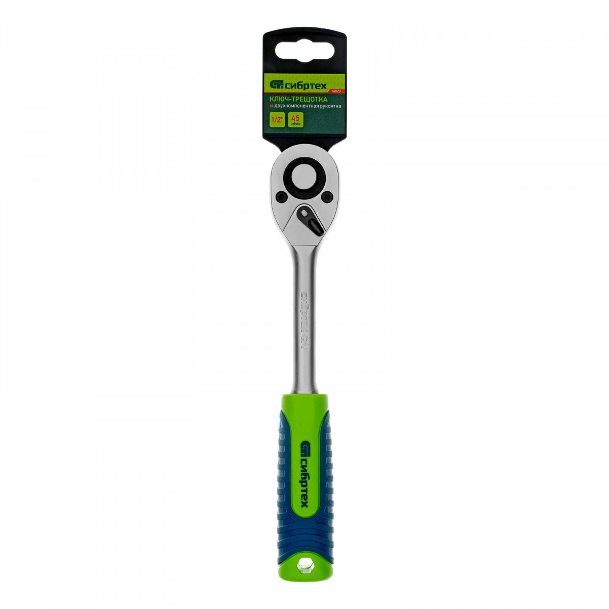Ключ-трещотка Сибртех 14023 с присоединительным квадратом 1/2", функцией быстрого сброса и храповым механизмом с 45 зубьями, имеет покрытие «матовый хром» и используется с торцевыми головками, имеющими посадочное гнездо соответствующего размера. Предназначен для закручивания и раскручивания резьбового крепежа. Храповой механизм с 45 зубцами обеспечивает плавное вращение. Ключ применяется для ремонта автомобилей, техники и оборудования, пригодится также дома и на даче.
