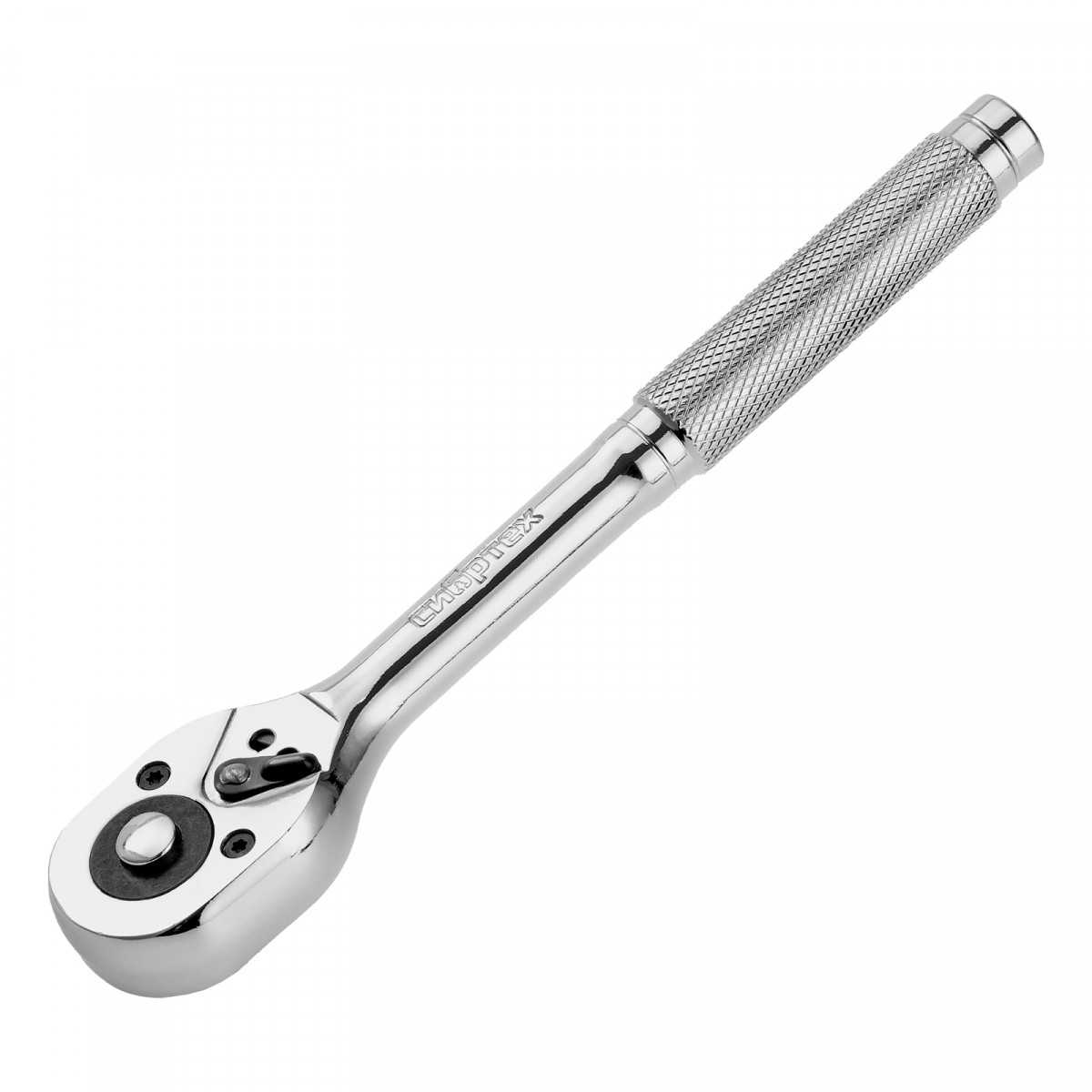 Цельнометаллический хромированный ключ-трещотка Сибртех 14018 из стали CrV, с посадочным размером 3/8″ и 45-зубым храповым механизмом, с функцией быстрого сброса, используется для монтажа и демонтажа резьбовых соединений. Предназначен для установки торцевых головок, адаптеров и удлинителей. Цельнометаллическая конструкция отличается повышенной прочностью, что позволяет работать со значительным усилием. Инструмент пригодится дома, в гараже и в поездке.