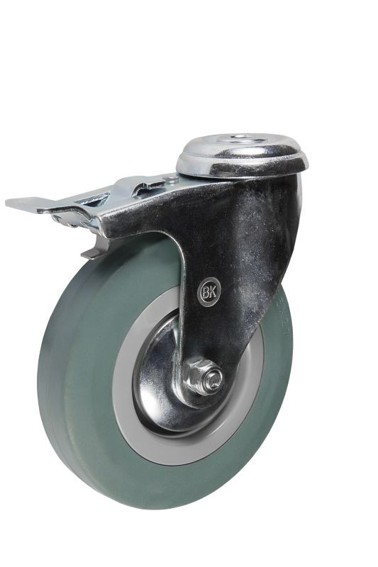 Колесная опора с серой резиной поворотная с тормозом адаптирована для работы в помещениях. Серая резина обладает очень мягким ходом и является достаточно маневренной.