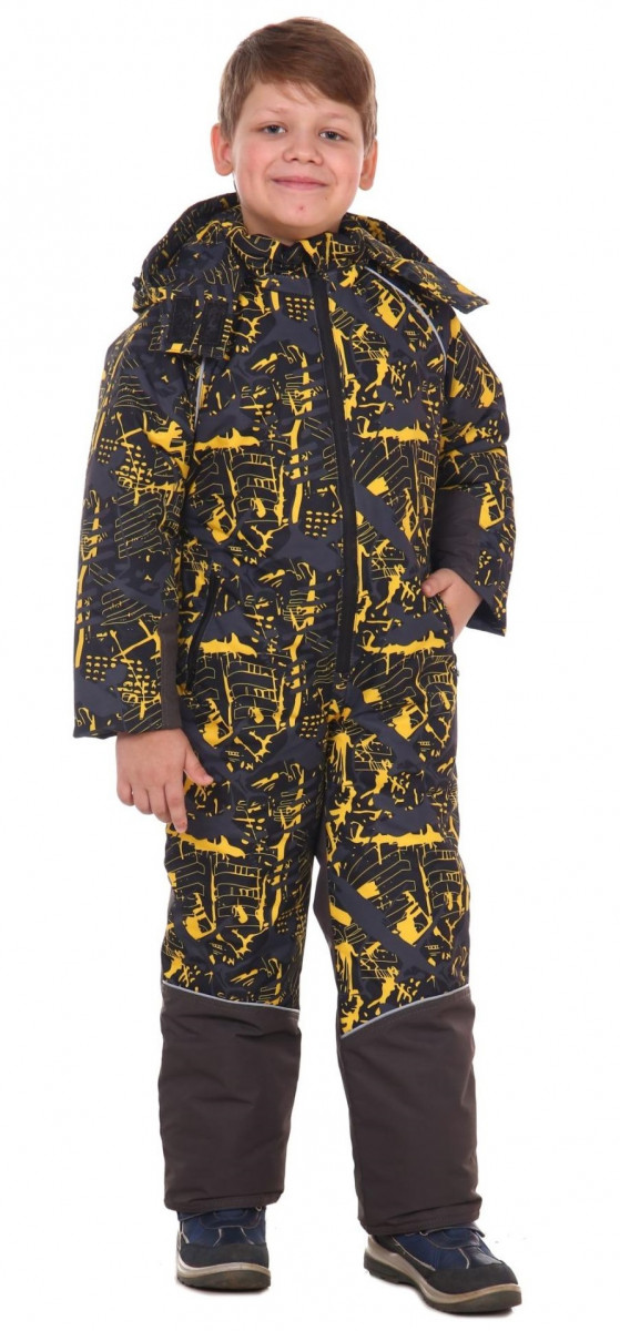 Комбинезон с застежкой на молнию. Имеется два боковых прорезных кармана на молнии, утепленные флисом. Съемный капюшон на липучках, регулируется резинкой с фиксаторами. Воротник - стойка, утеплен флисом. На куртке имеется огибающая замок молнии планка, для исключения контакта замка молнии с шеей и подбородком. Рукава имеют внутренний эластичный трикотажный манжет. Брючины комбинезона усилены наколенниками. Снизу комбинезон фиксируется резинкой.