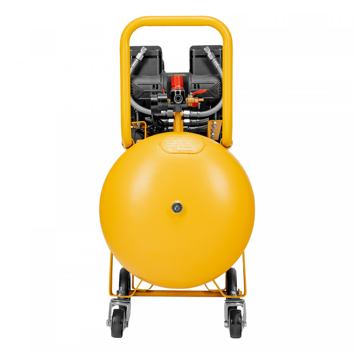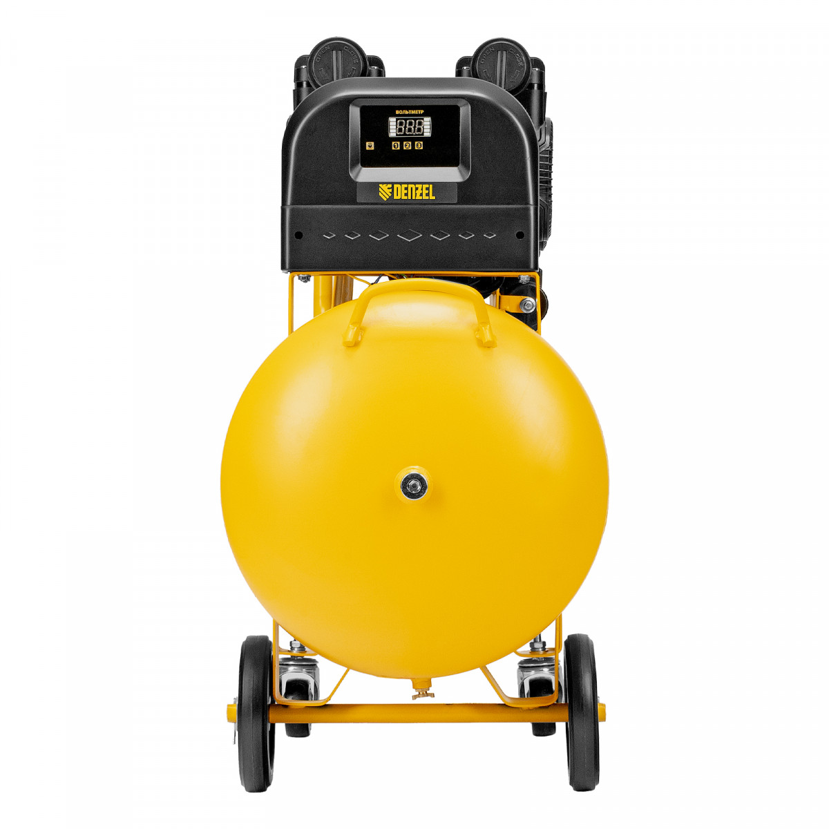 - Мобильность — 4 колеса, в том числе 2 поворотных, и транспортировочная рукоятка упрощают перемещение компрессора по рабочей зоне.