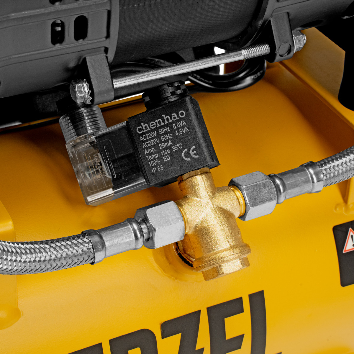 • Автономность — специальное реле останавливает компрессор по достижении максимального рабочего давления и запускает двигатель при падении давления до минимального уровня.