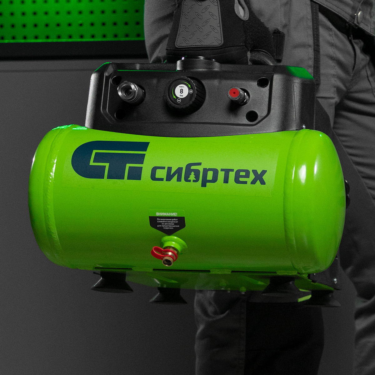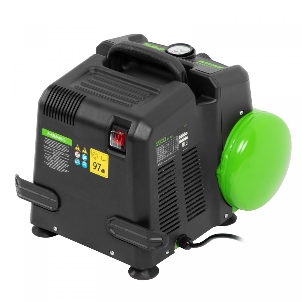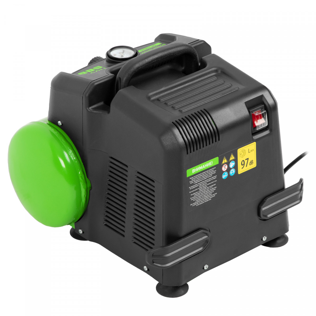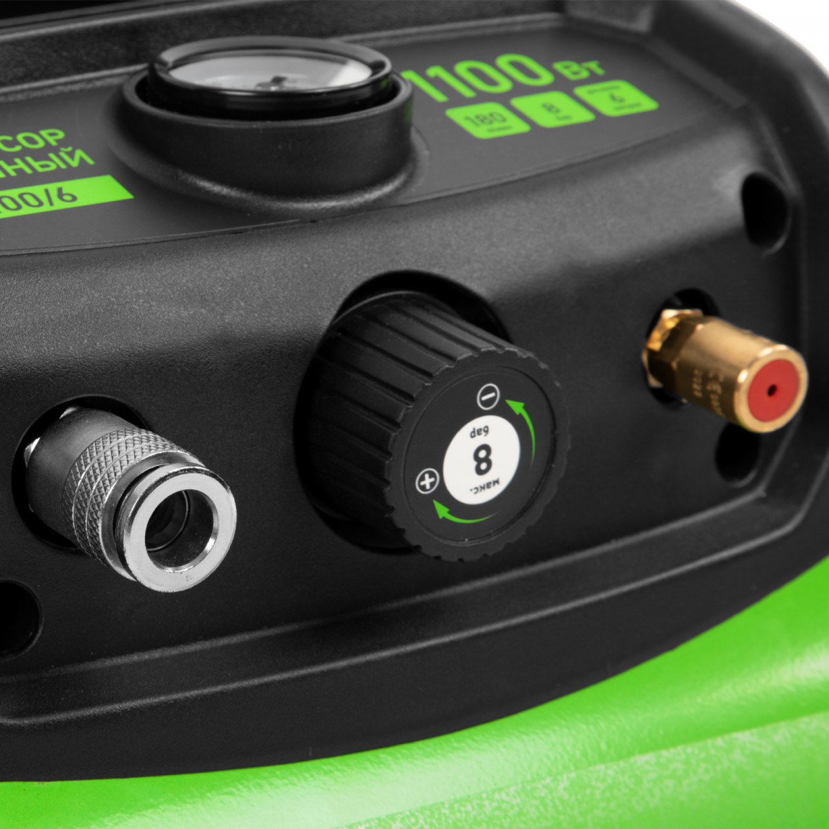 • Контроль давления в ресивере — в верхней части корпуса расположен манометр, для считывания показателей не нужно наклоняться.