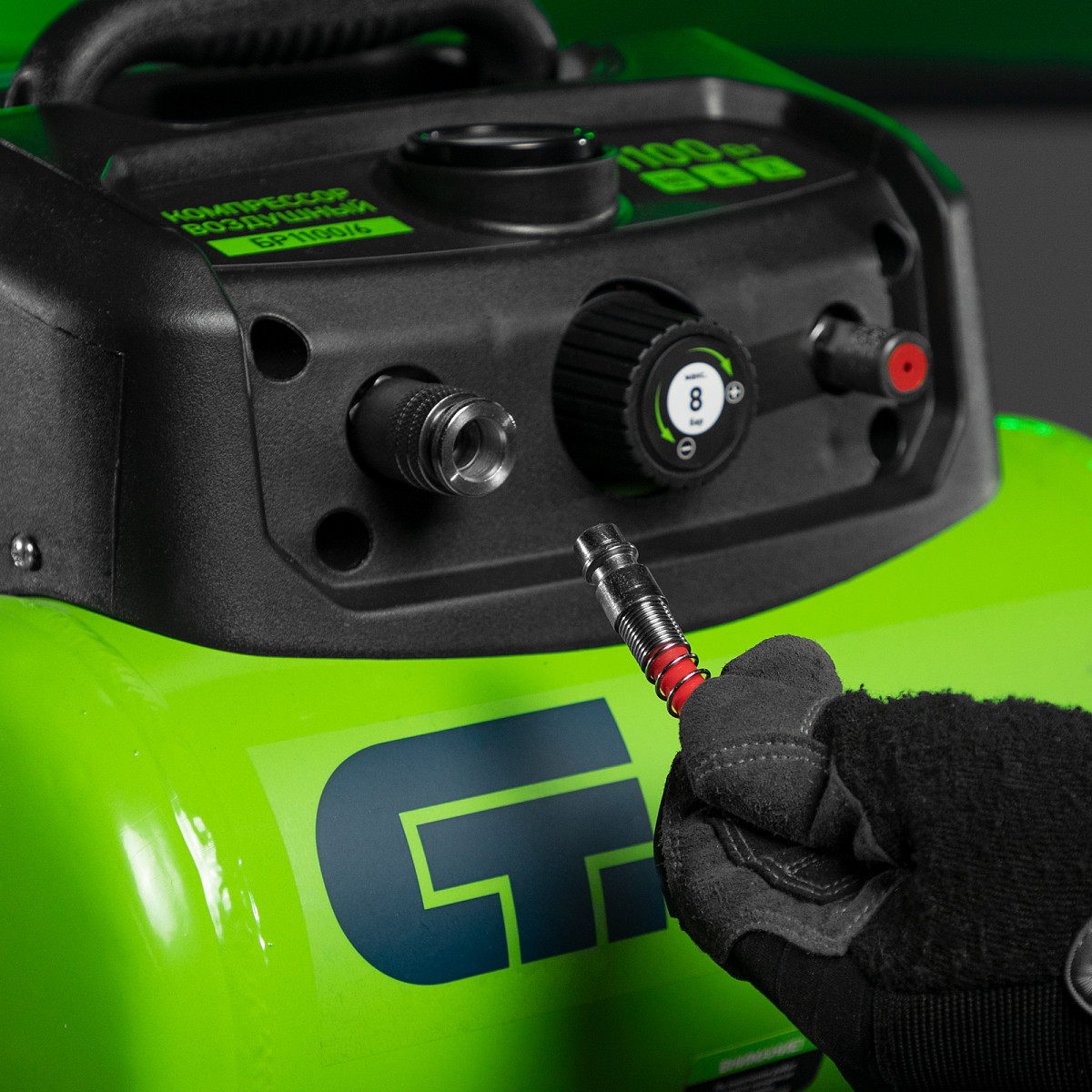 • Простая подготовка к работе — быстроразъемный выходной коннектор «Рапид» (евро) позволяет легко подключить пневмоинструмент.