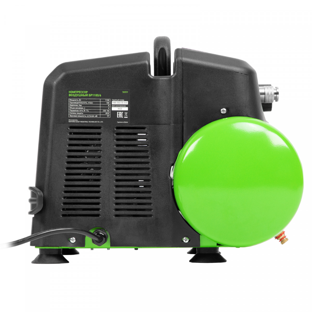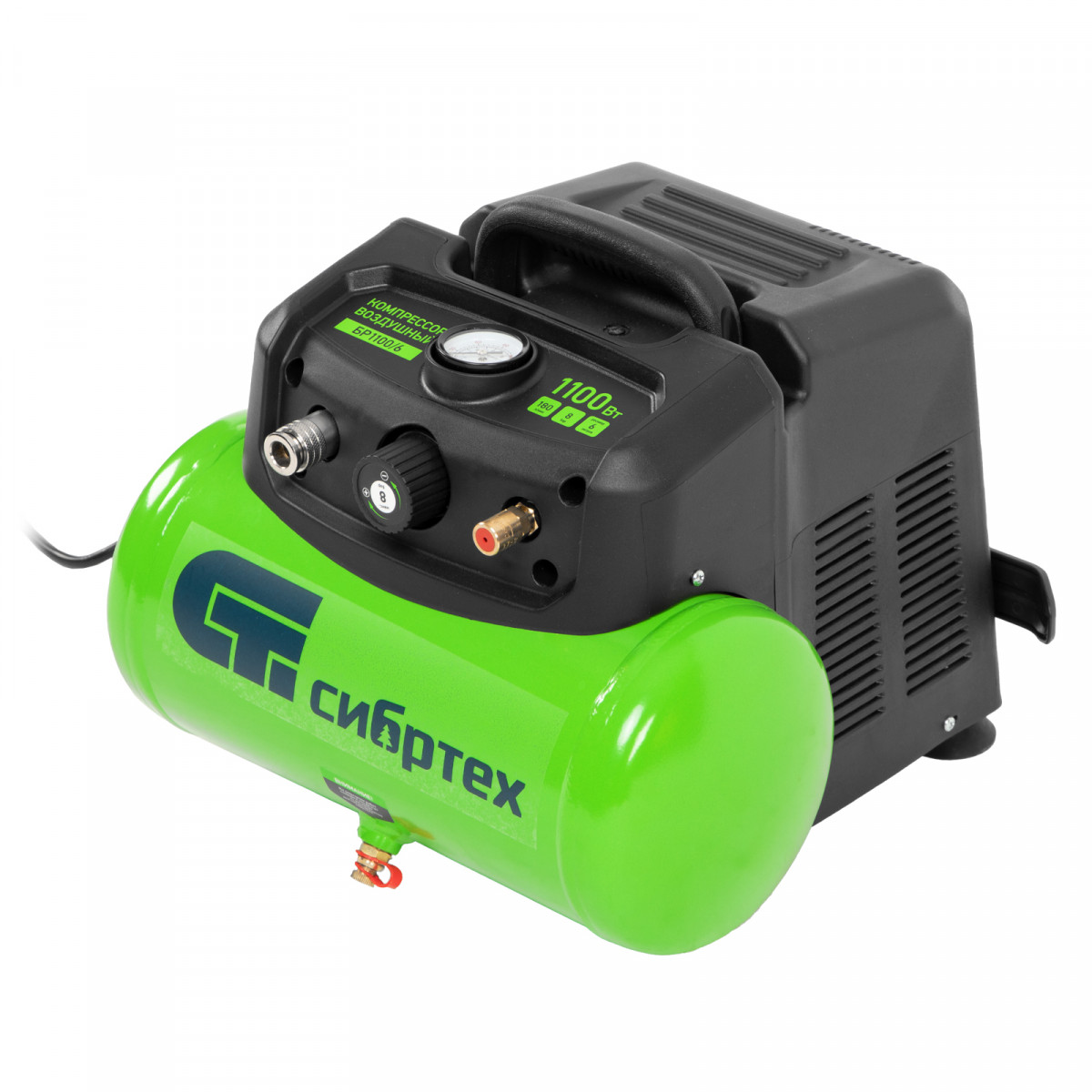 Воздушный безмасляный компрессор Сибртех BL 1100/6 58059 мощностью 1100 Вт, с ресивером емкостью 6 литров, служит для подачи сжатого воздуха под давлением до 8 бар со скоростью 180 л/мин. К нему можно подключить краскораспылитель, продувочный пистолет, заклепочник, пистолет для накачки шин и другой пневмоинструмент. Отсутствие масла делает компрессор оптимальным для выполнения покрасочных работ и продувки электронных компонентов. Устройство предназначено для бытового использования.,Одна из основных особенностей данной модели — компактность и удобство в перевозке. Компрессор отличается небольшим весом и дополнен эргономичной транспортировочной ручкой.