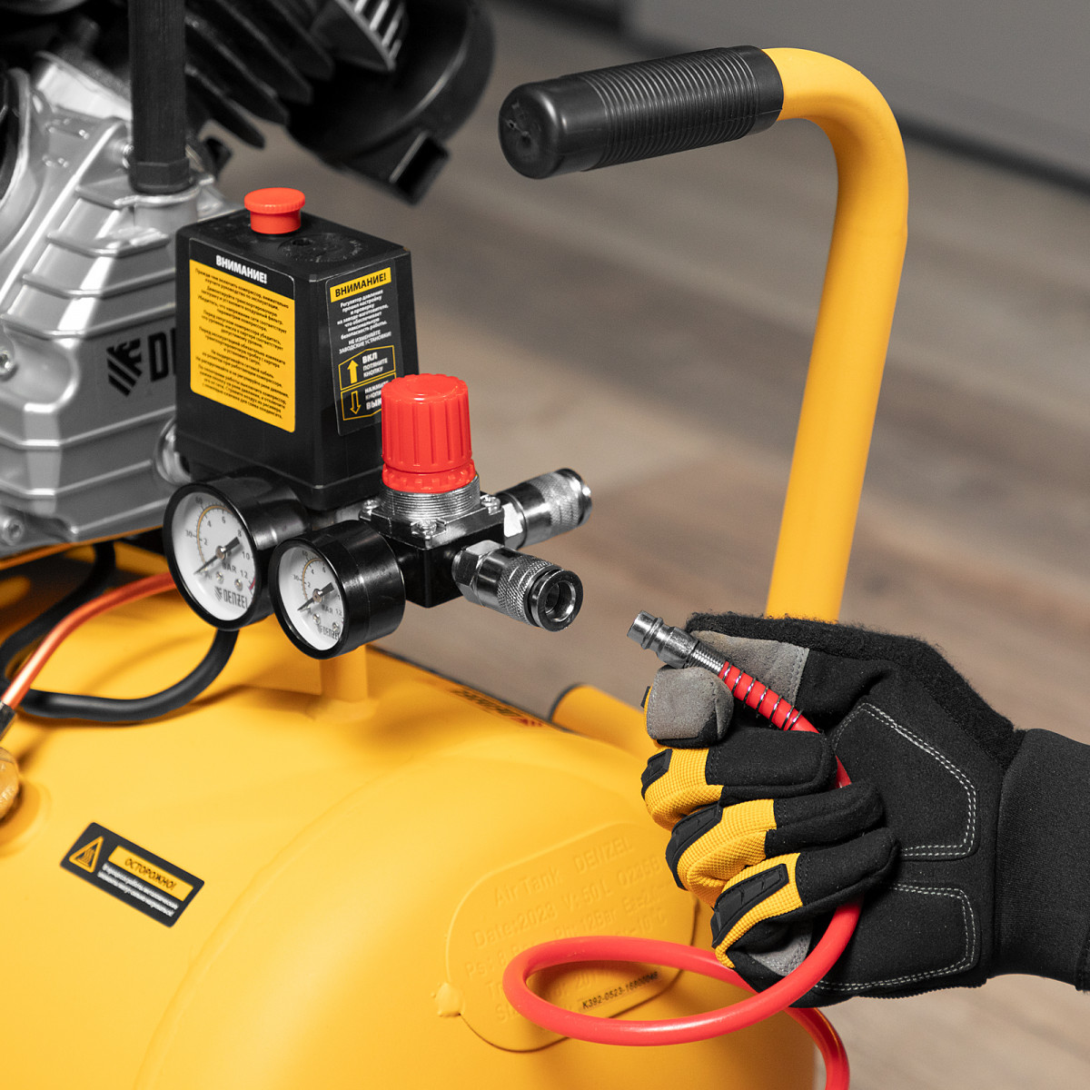 - Контроль давления и расхода воздуха — компрессор оснащен регулятором и двумя манометрами.