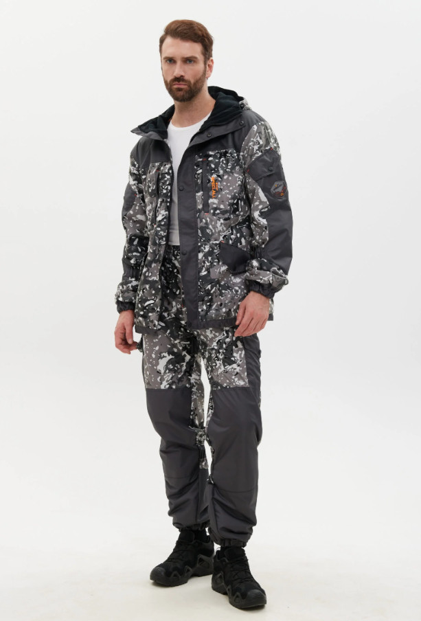 Костюм демисезонный TOR состоит из куртки и брюк изготовлен из мембранных тканей Алова и отделки тканью Кошачий Глаз, подкладка - флис. Куртка прямого силуэта на молнии с ветрозащитной планкой на кнопках, с боков приталена резинками, слева внутренний карман на липучке. Капюшон вшивной с козырьком, имеет утягивающую кулиску с фиксаторами для регулировки по объему. Внизу с двумя косыми прорезными карманами на клапане, объемные карманы на рукавах. Брюки анатомического кроя с подкладкой из флиса, низ на резинке, застежка гульфик на кнопках, пояс на широкой прошитой резинке, на поясе шлёвки для ремня. К поясу крепятся съёмные подтяжки-кобура на пуговицах, спереди два боковых прорезных кармана, сзади два накладных кармана на липучках, на уровне колена два боковых накладных кармана на кнопках, по низу брюк на резинке.