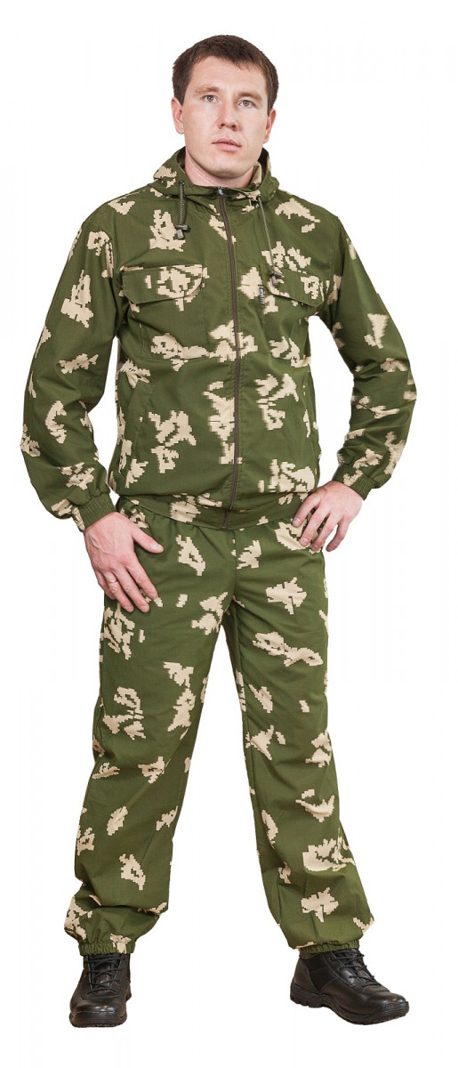 Летний универсальный костюм «Пионер» из легкой и прочной дышащей ткани -отличный выбор для летней рыбалки, походов, тактических игр, а большой выбор камуфляжных расцветок порадует охотников. Низ укороченной куртки собран на широкую простроченную резинку. Капюшон регулируется по овалу лица. Два нагрудных кармана закрываются на клапаны с липучками, два нижних кармана с двойными листочками без застежки. Низ брюк и рукавов на резинке. Пояс брюк полностью эластичный, дополнен шлевками и внутренней утяжкой на шнур. Два кармана у пояса без застежки.
