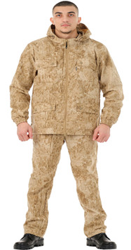 "Удлиненная куртка прямого кроя регулируется по ширине внутренней кулисой на талии, а также утяжкой шнуром по низу. Застегивается на молнию с двумя бегунками. Низ рукавов собран на широкую простроченную резинку. Капюшон регулируется шнуром. Два нагрудных и два нижних накладных кармана застегиваются на клапаны с пуговицами. Свободные брюки прямого кроя, пояс на широкой простроченной резинке, дополнен широкими шлевками и утяжкой шнуром. Два глубоких кармана у пояса без застежки. Свободного кроя костюм, не стесняющий движений, из легкой и в то же время достаточно плотной ткани, способной защитить от укусов насекомых, царапин от ветвей в лесных зарослях. Отлично подойдет для летних походов, рыбалки, тактических игр."