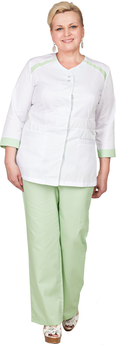 Костюм состоит из блузы (туники) и брюк. Блуза: - центральная потайная застежка на кнопки; - полуприлегающего силуэта с декоративными вставками; - рукава 3/4 с притачной манжетой из отделочной ткани; - завышенная линия талии с притачным поясом. Брюки: - прямого покроя; - пояс частично с эластичной лентой; - прорезные боковые карманы. Цвет: белый -св./зеленый Основная ткань: 'Оптима' Состав: 35%вискоза 65%п/э Отделочная ткань: 'Оптима' Состав: 35%хлопок 65%п/э