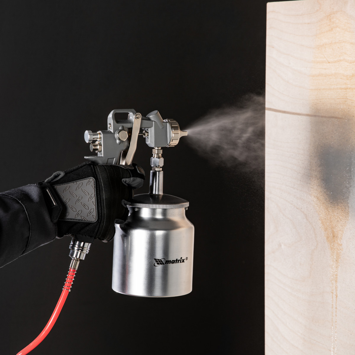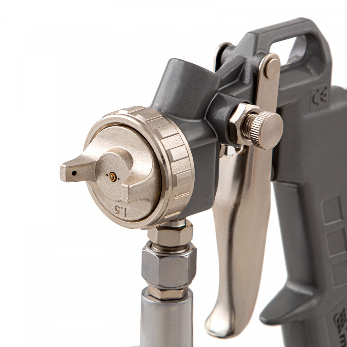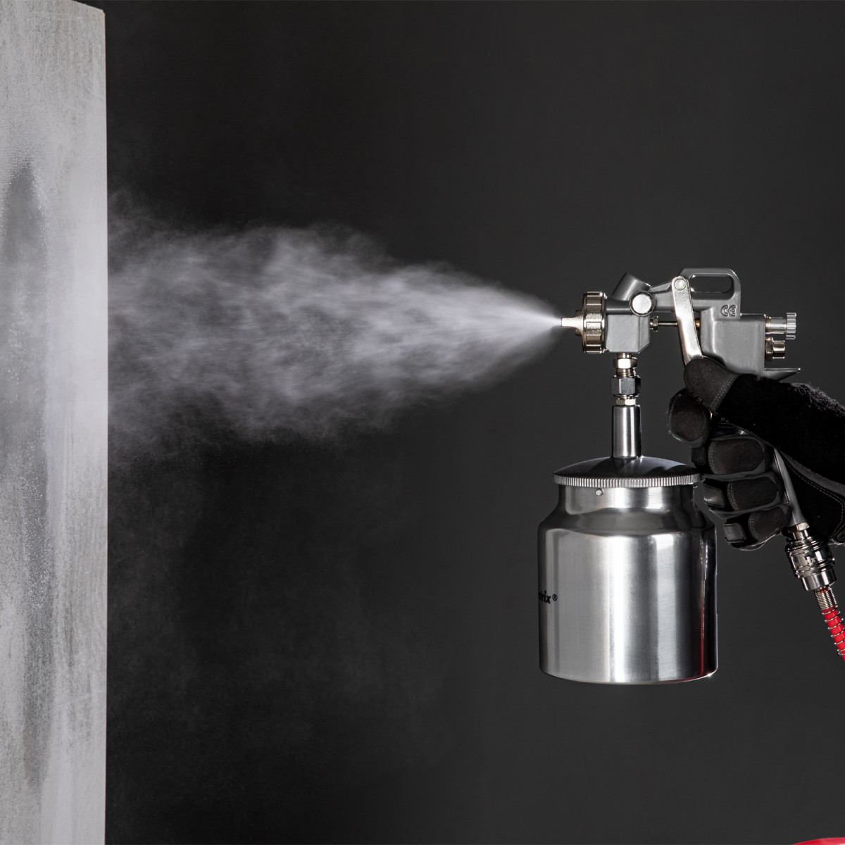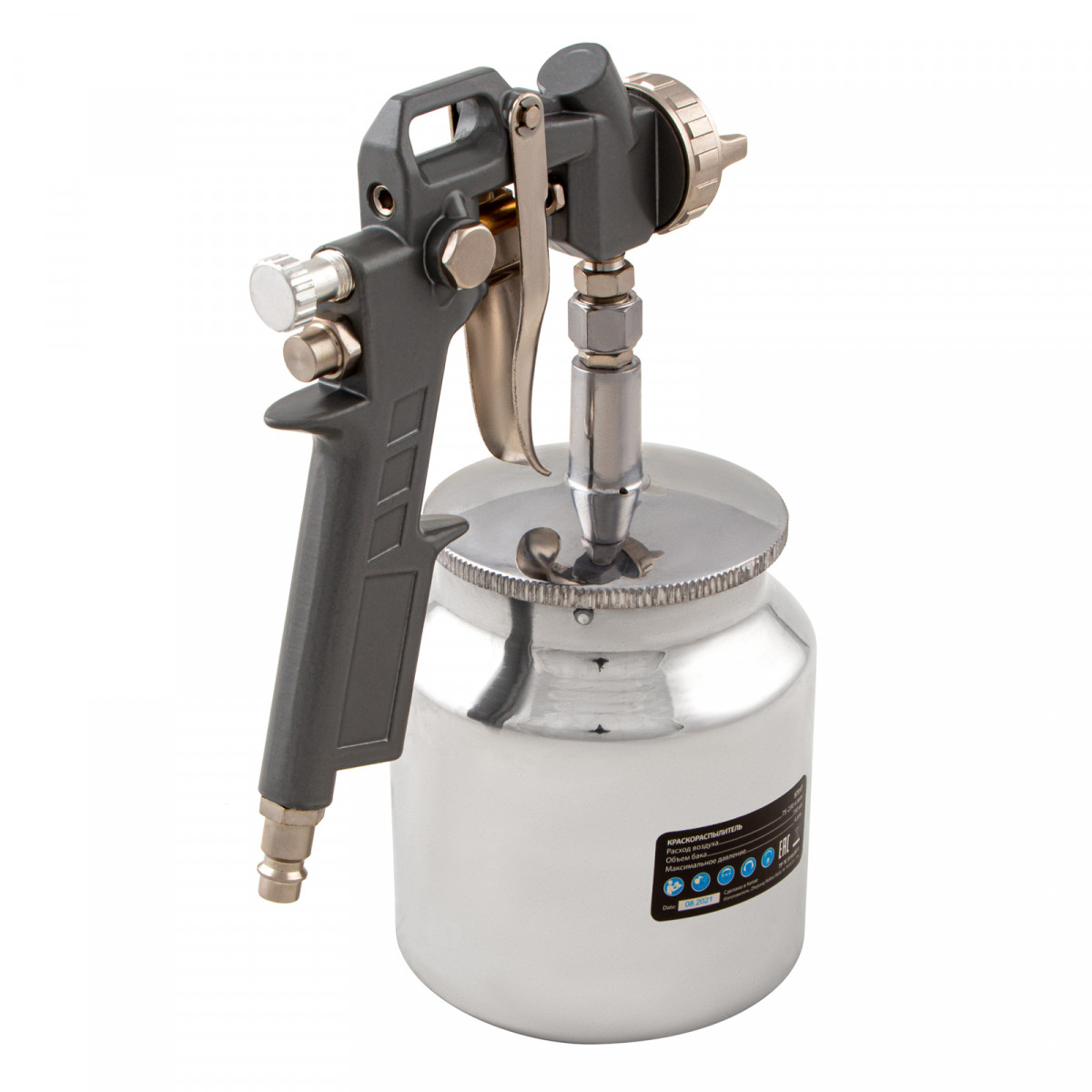 • Нижнее расположение бака — краскораспылитель можно ставить на горизонтальные поверхности, также он не загораживает обзор в процессе работы.
