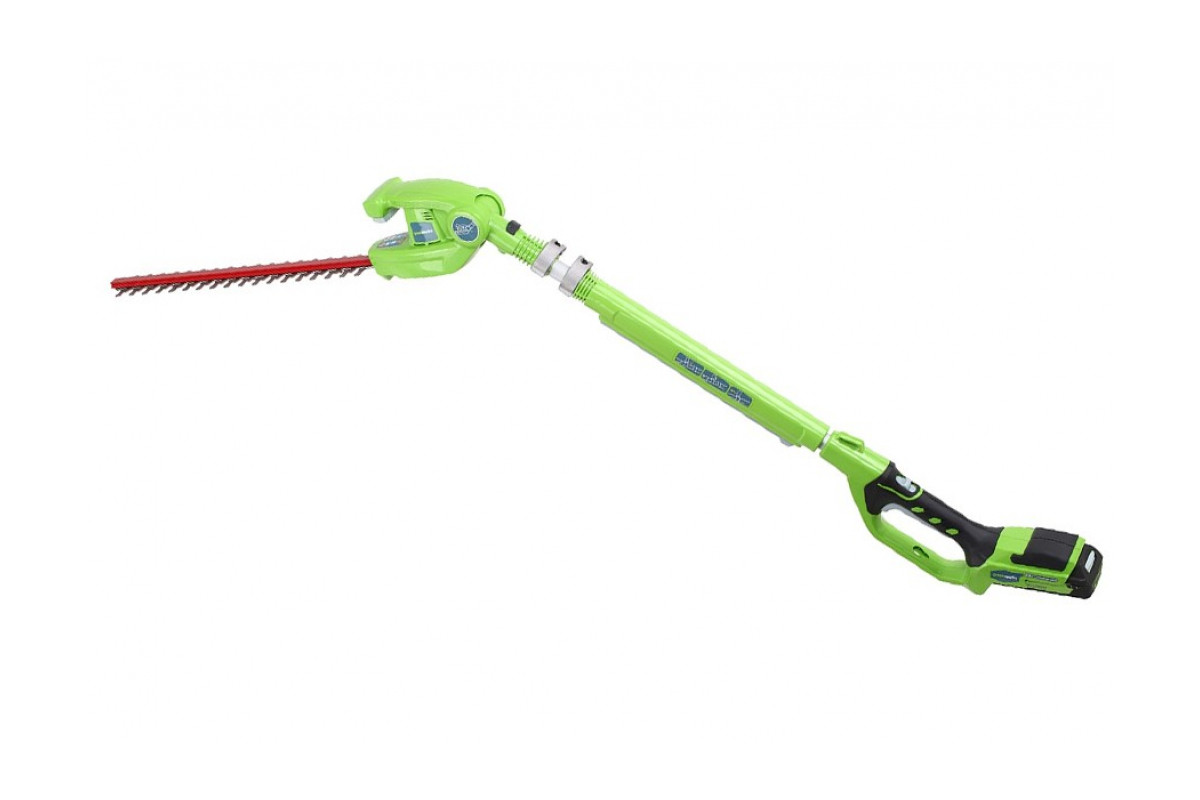 Аккумуляторный телескопический кусторез GreenWorks G24PH51 2200207 предназначен для формирования живых изгородей и ухода за садовым участком. Лезвие имеет семь положений наклона. Штанга удлиняется и позволяет работать с деревьями до 5 метров. Модель питается от литий-ионного аккумулятора 24В, который подходит ко всей линейке G-24.