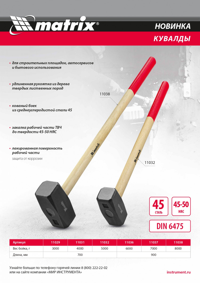 Кувалда Matrix 11036 длиной 900 мм, с кованой головкой весом 6000 г и деревянной рукояткой — ударный инструмент, позволяющий демонтировать бетонные, каменные и кирпичные конструкции, а также проводить сборочные работы. Удлиненная ручка повышает силу наносимых ударов, кованая головка обеспечивает надежность и долговечность инструмента. Кувалда применяется при проведении строительных работ, будет полезна в гараже или на загородном участке.