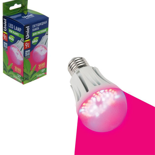 Широкий угол светового потока 270° обеспечивает равномерное освещение растений от лампы LED-A60-9W Uniel.