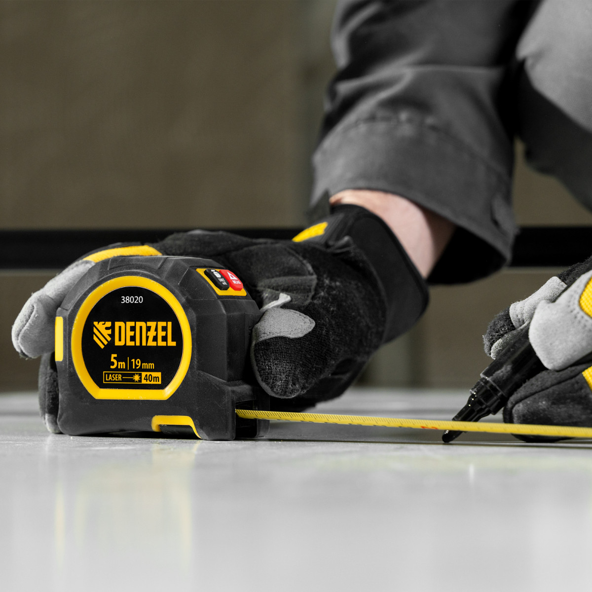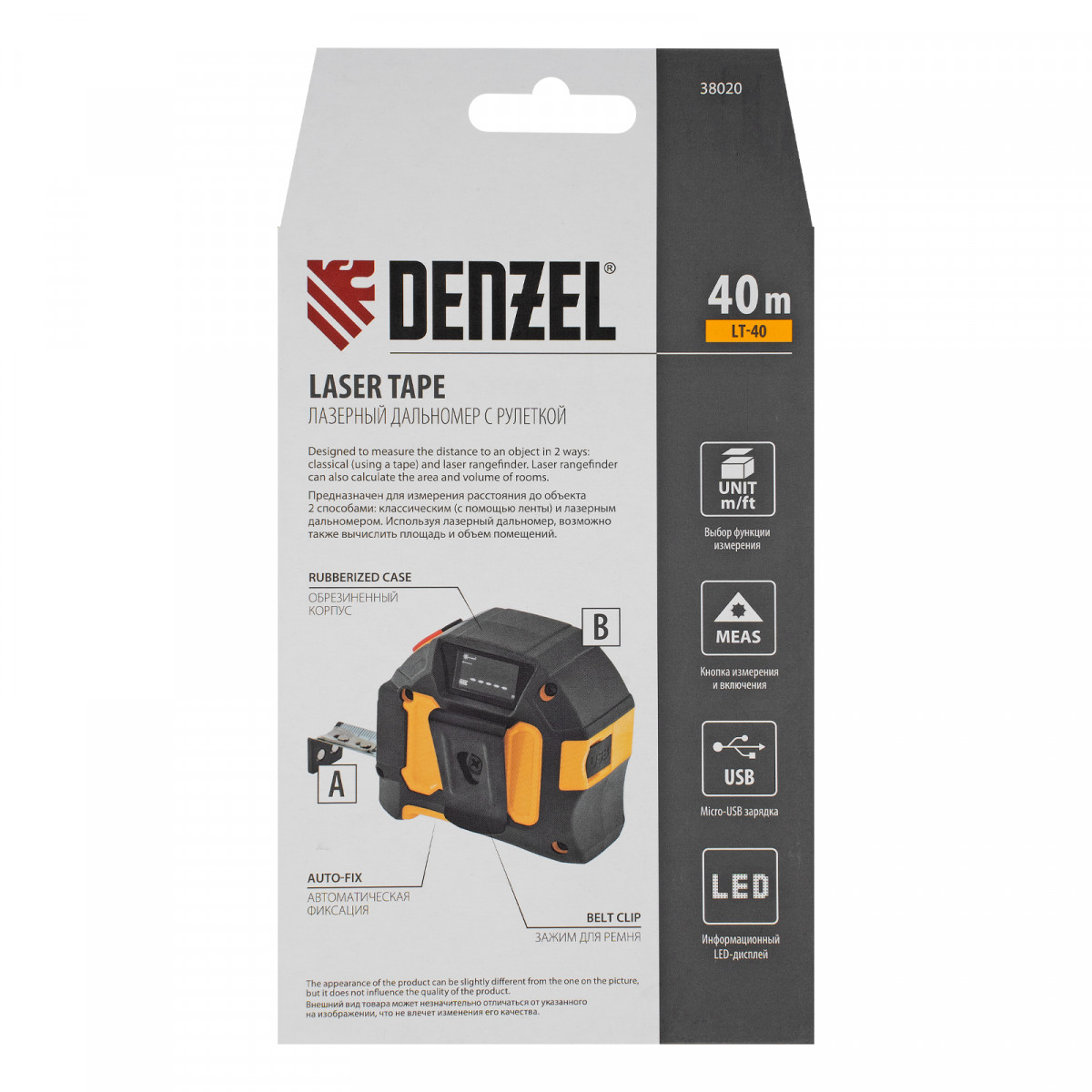 Лазерный дальномер с рулеткой LT-40, 5м x 19 мм, дальномер 40м, автомат. фиксация Denzel