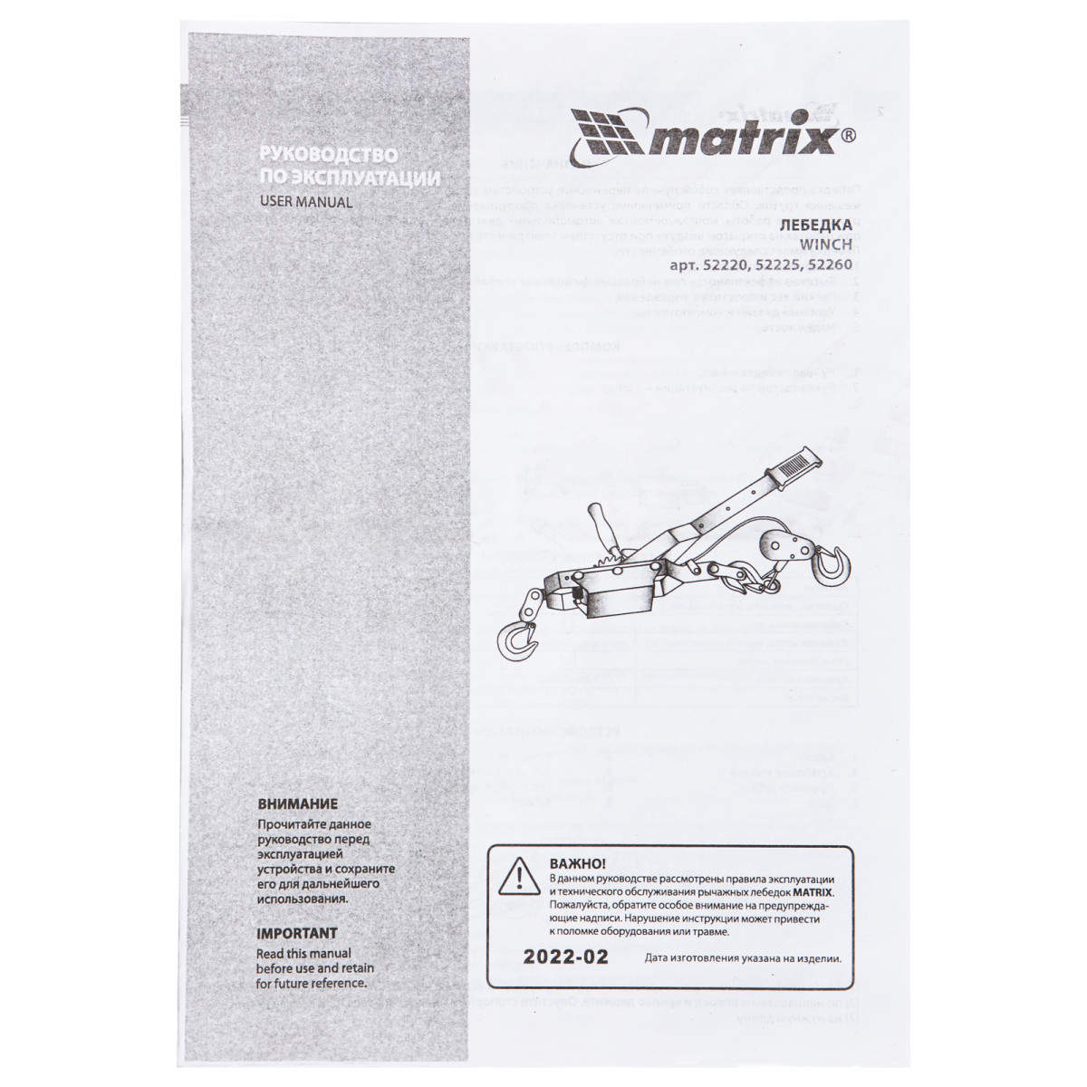Лебедка рычажная, тяга 2 т, подъем 0.8 т, одинарное храповое колесо Matrix