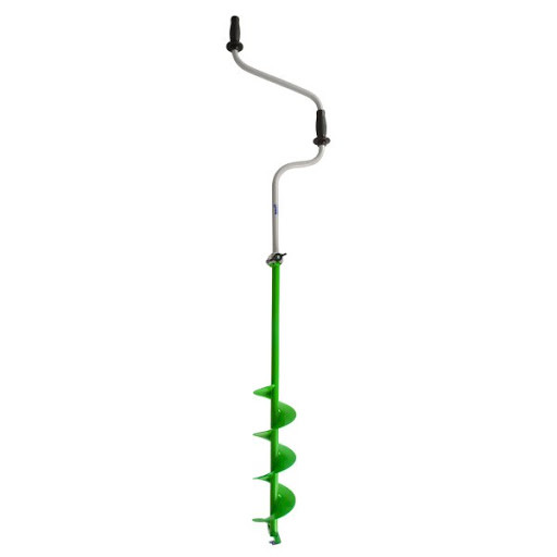 Верхняя рукоятка ледобура смещена относительно оси шнека на 130 мм, а нижняя на 150 мм. Такое расположение рукояток позволяет вращать ледобур одновременно двумя руками, тем самым, не прикладывая особых усилий, увеличивая скорость бурения лунок во льду.