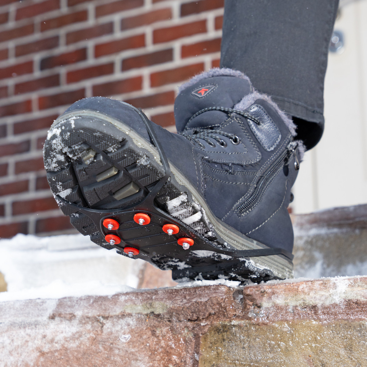 - Форма накладок позволяет закрепить их на любой обуви, в том числе сапогах или ботинках на каблуке, поэтому ледоступы подходят и мужчинам, и женщинам.