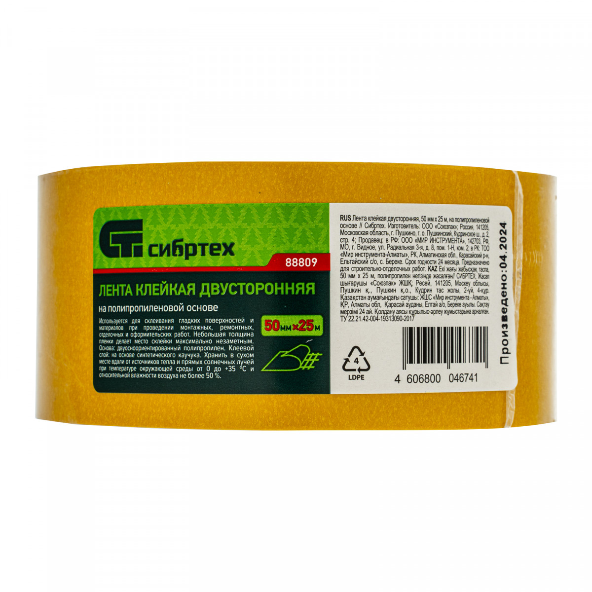 Клейкая двусторонняя лента Сибртех 88809 размером 50 мм х 25 м, на полипропиленовой основе, надежно крепится к горизонтальным и вертикальным поверхностям, которые не подвергаются сильным механическим нагрузкам. Благодаря высоким адгезионным свойствам лента подходит для работы с самыми разными материалами: картоном, деревом, пластиком, резиной, стеклом, металлом. Пригодится для занятий дизайном, а также решения различных задач в быту.