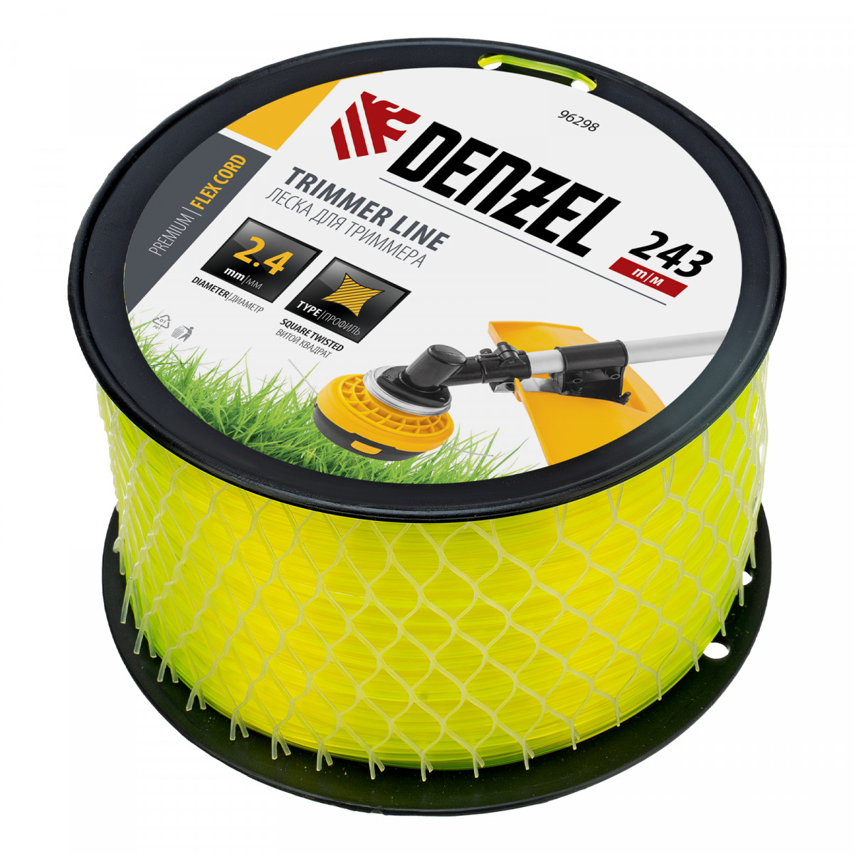 Леска для триммера Denzel FLEX CORD 96298 с сечением «витой квадрат», толщиной 2,4 мм и длиной 243 м, на DIN-катушке, предназначена для скашивания крупностеблевой растительности. Используется на бензиновых триммерах с объемом двигателя 25-52 см3 и электротриммерах мощностью от 1 до 1,5 кВт.