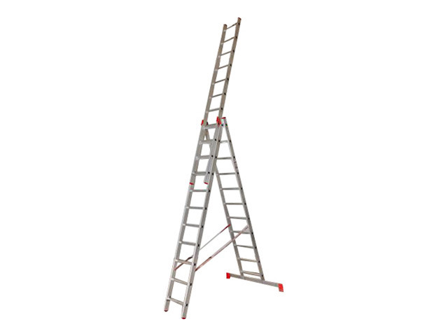 Профессиональная алюминиевая трехсекционная лестница выдержит большие нагрузки благодаря уникальной конструкции рамы, широкой траверсе, которая обеспечивает устойчивость всей конструкции. Специальный рельеф ступеней препятствует скольжению при использовании лестницы. Лестница снабжена самозахватывающими фиксирующими крюками, которые препятствуют самопроизвольному рассоединению секций.
