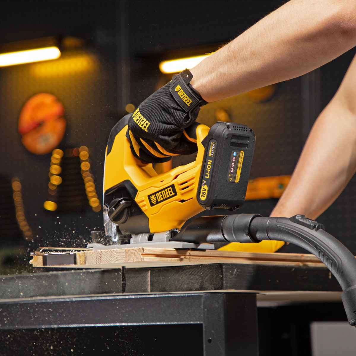Аккумулятор с интеллектуальной системой распознавания нагрузки обеспечивает длительную работу лобзика и обладает высоким ресурсом. Совместим с любым аккумуляторным инструментом Denzel battery system 18V.