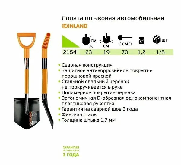Лопата автомобильная 185х225х700 мм цельнометаллическая FINLAND