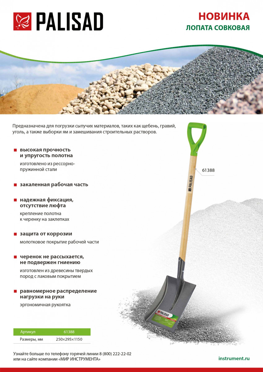 Совковая лопата Palisad 61388 с деревянным лакированным черенком, имеет рабочую часть шириной 250 х 295 мм и удобна для выборки ям, перемещения щебня, угля, песка. Используется также для приготовления строительных смесей. Боковые края полотна загнуты кверху, поэтому лопатой удобно набирать грунт, сыпучие и гранулированные материалы. Лопата будет полезна на строительной площадке и загородном участке.