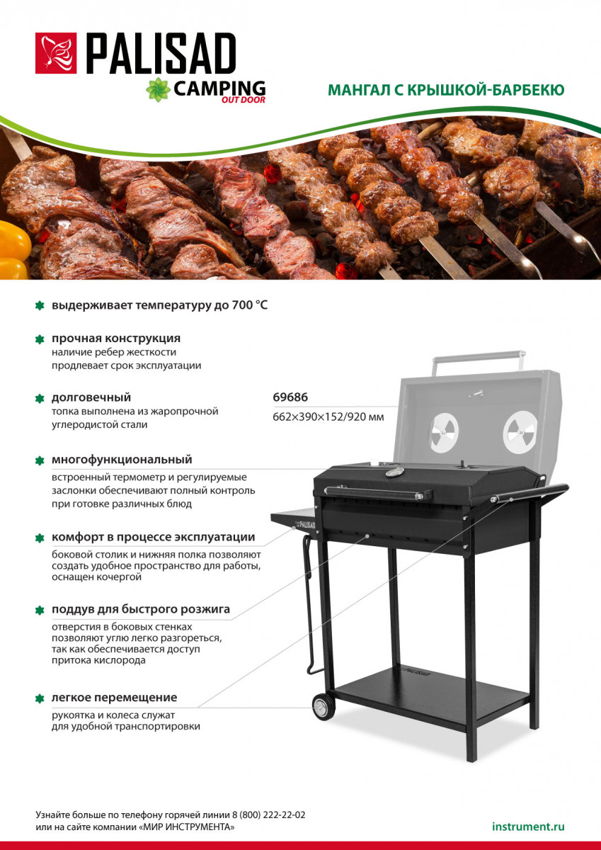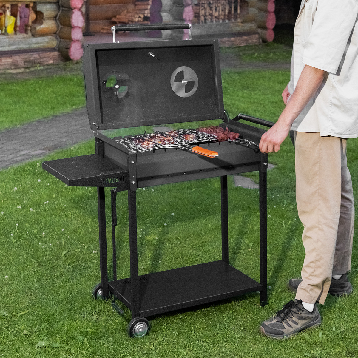 • Удобное перемещение — мангал снабжен транспортировочной рукояткой и 2 колесами.