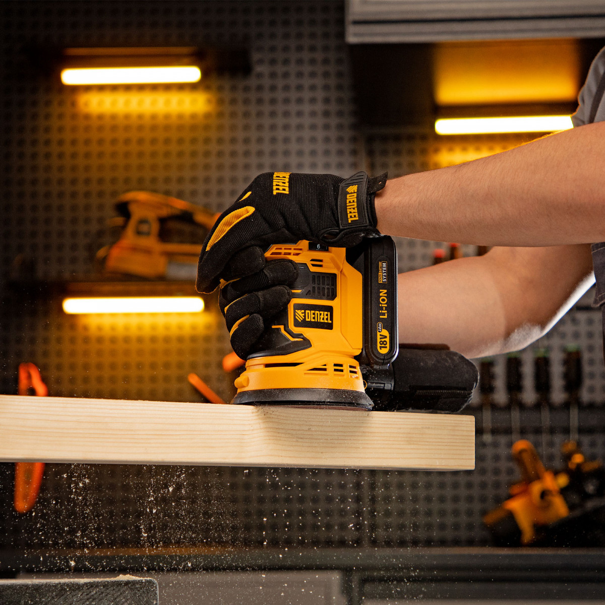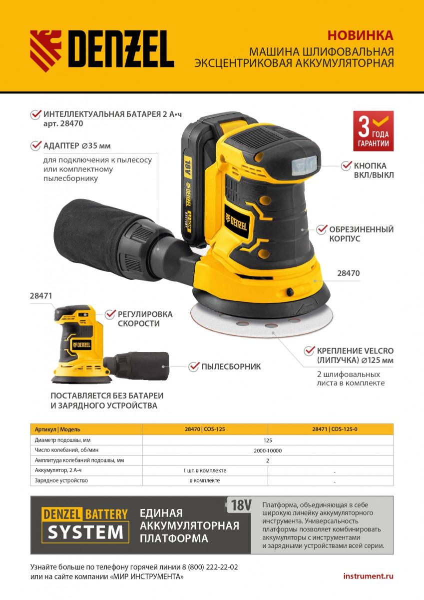• Универсальность — к шлифовальной машине подходит аккумулятор 4Ач Li-ion, совместимый с любым инструментом 18V Denzel battery system серии IB (в комплект поставки не входит).