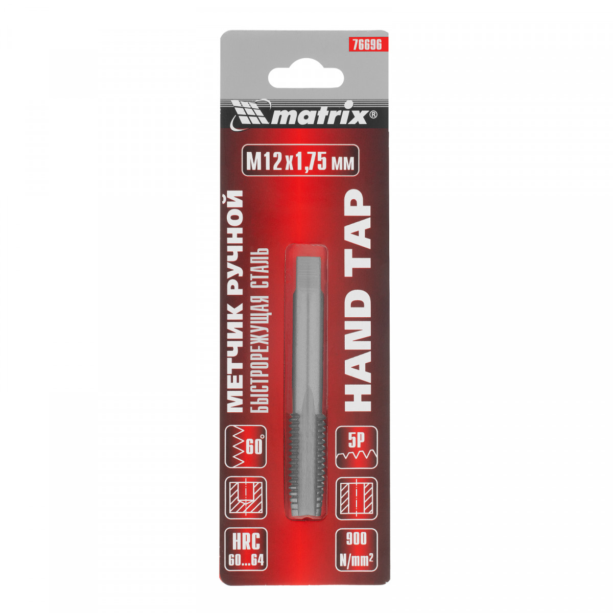 Ручной метчик Matrix 76696, HSS, — резьбонарезной инструмент, который используется для создания резьбы диаметром М12 и шагом 1,75 мм. Оптимален для работы с деталями из твердой стали прочностью до 900 Н/мм². Нарезает резьбу за один проход. Метчик устанавливается на метчикодержатель с патроном под хвостовик 7 мм. Будет полезен в слесарной мастерской, а также дома или в гараже.