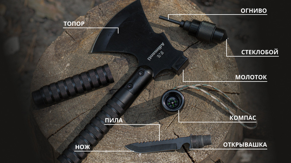 Топор Adimanti AXE-003 является мультифункциональным изделием, состоящим из нескольких полезных инструментов: