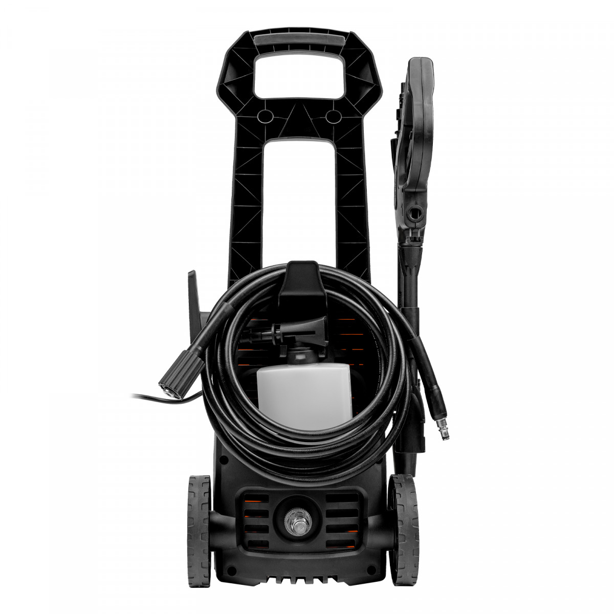 - Продуманная конструкция — кронштейны для шнура питания и шланга высокого давления, а также держатель для пистолета обеспечивают удобство хранения.