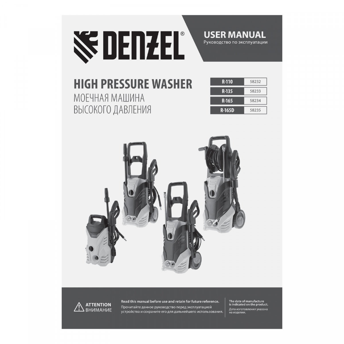 Моечная машина высокого давления R-135, 1800 Вт, 135 бар, 6 л/мин, колесная Denzel