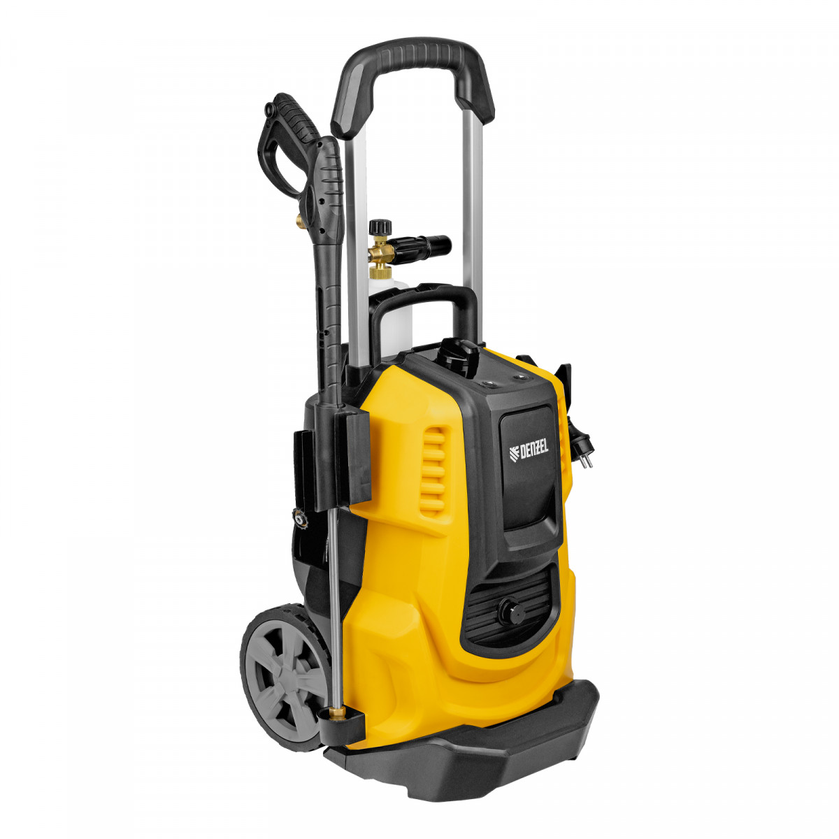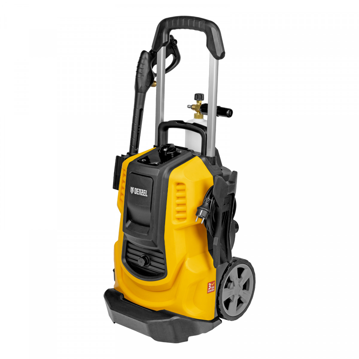 Мойка высокого давления, Барабан для шланга (установлен), Шланг высокого давления (установлен), Пистолет, Удлинитель пистолета, Сменные сопла 3 шт, Пеногенератор с бачком для моющего средства, Входной штуцер с фильтром, Быстросъемный коннектор шланга, кронштейн-держатель пистолета, Кронштей сетевого кабеля, Игла для прочистки сопла, Инструкция с гарантийным талоном