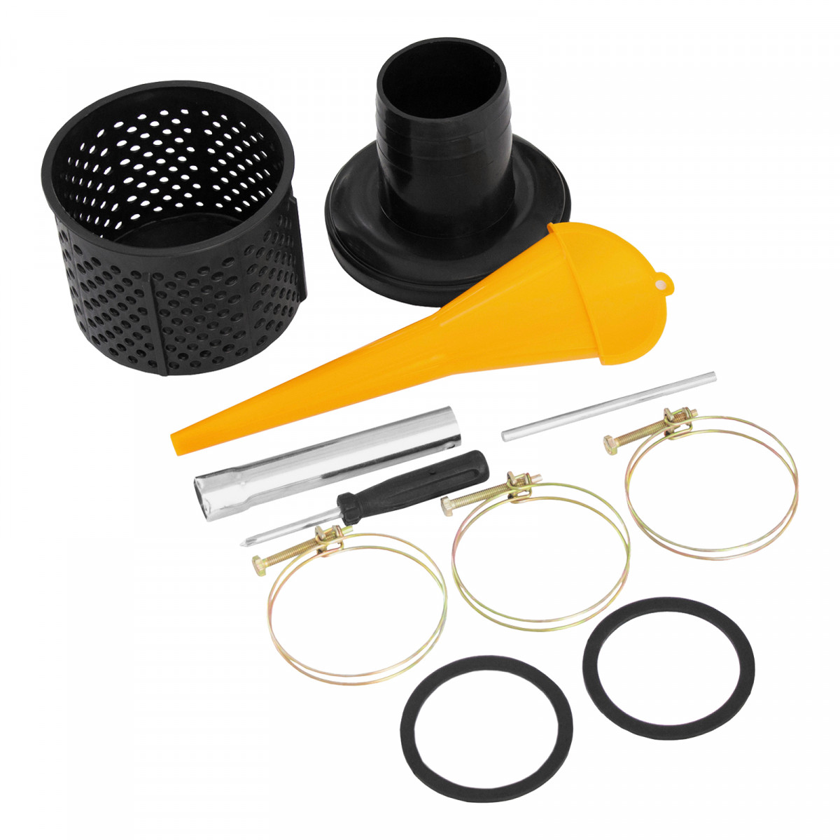 • Продуманная комплектация — к мотопомпе прилагаются хомуты и инструменты для установки патрубков.