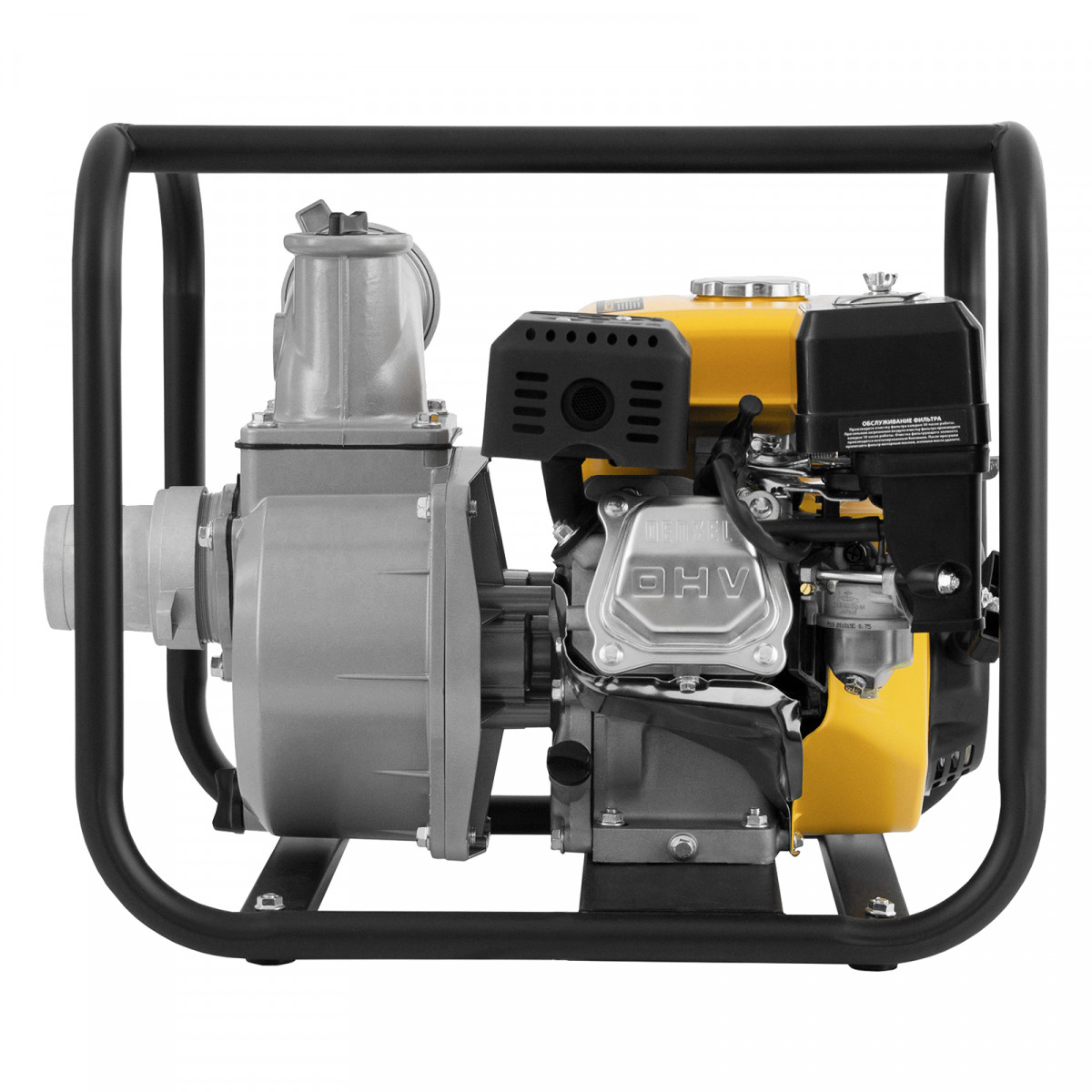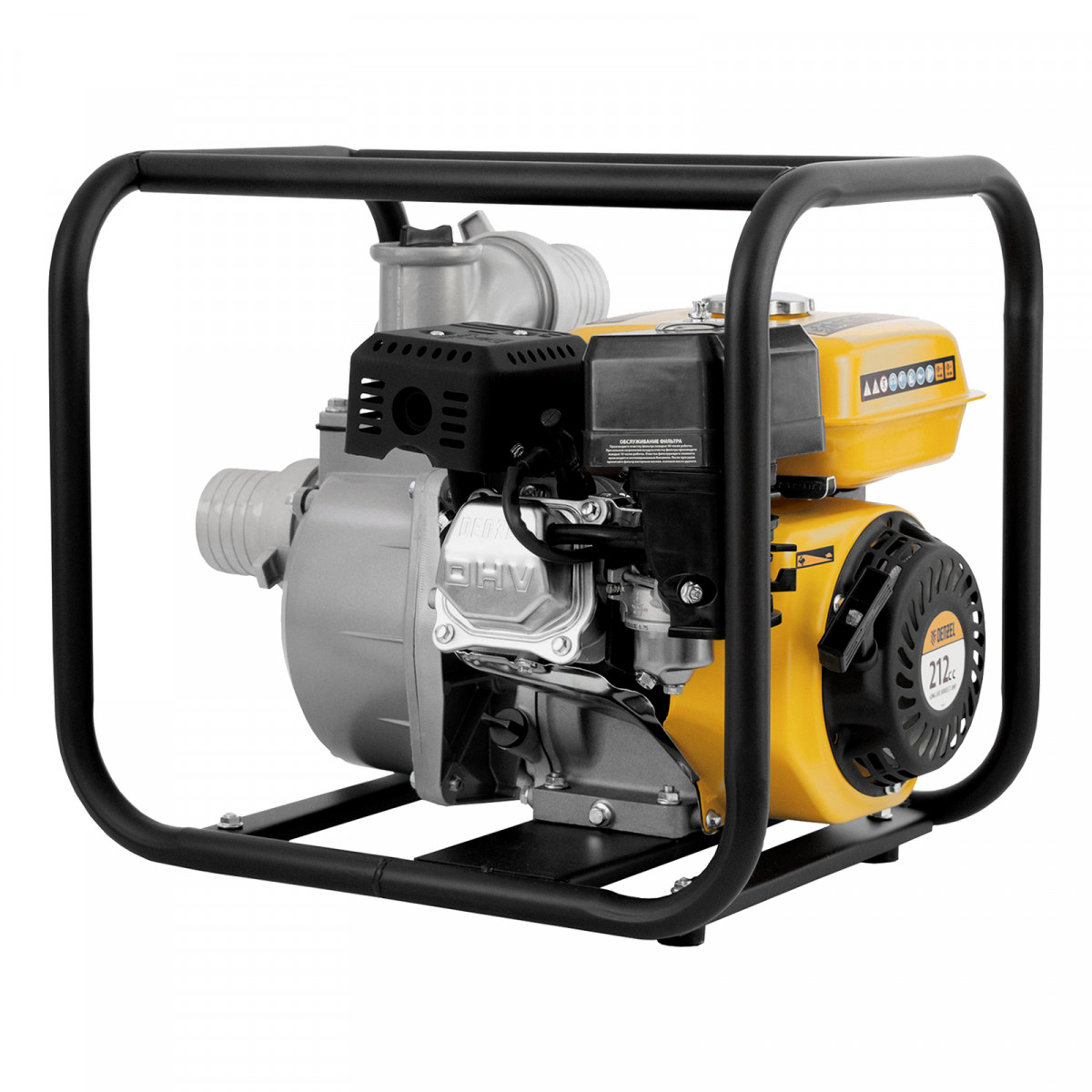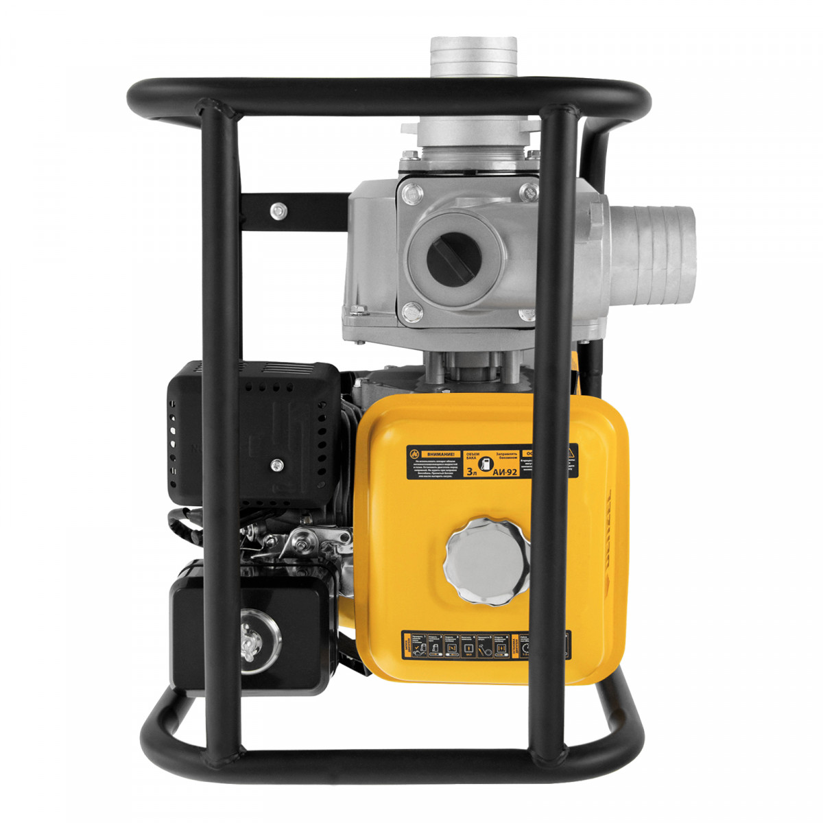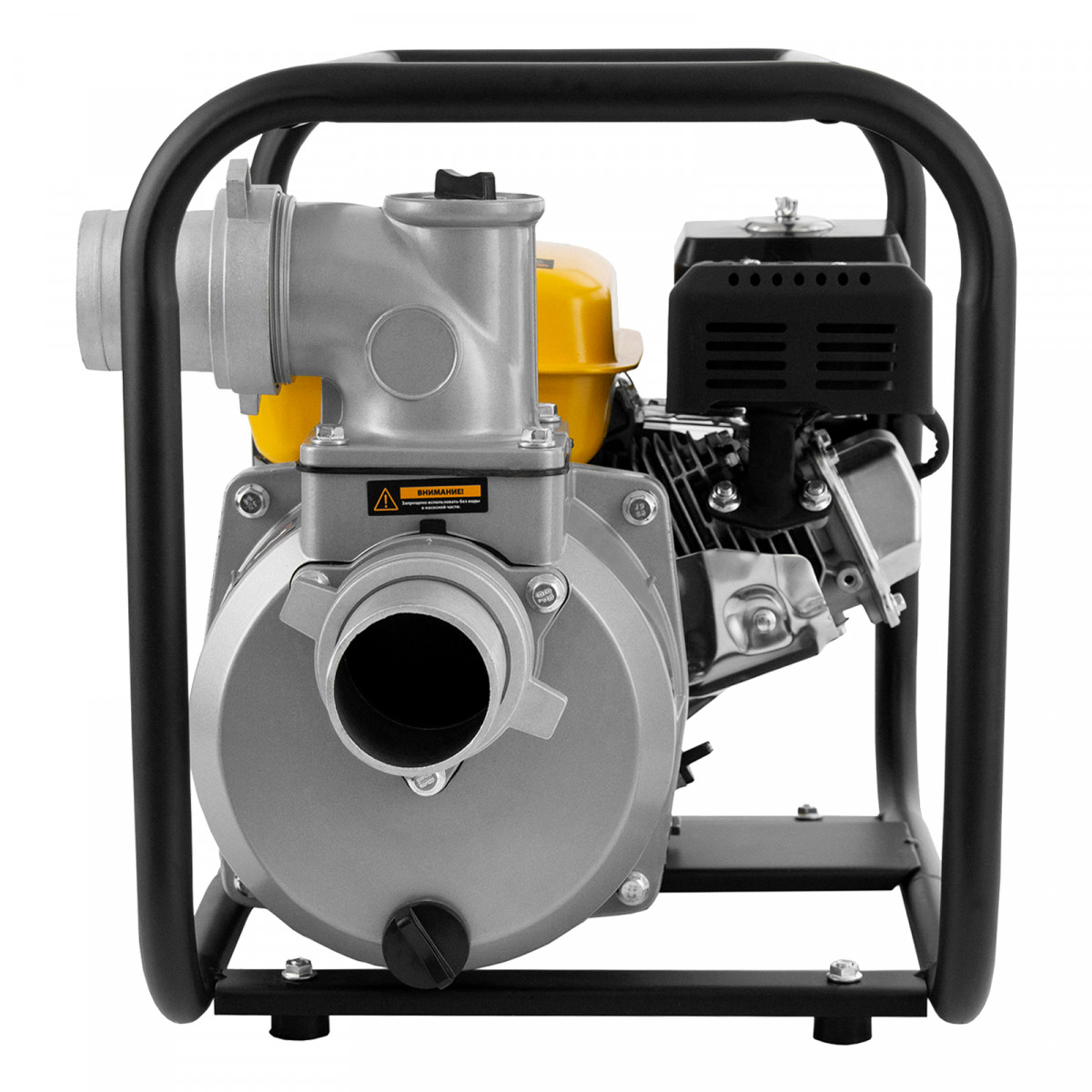 • Надежная конструкция — усиленная стальная рама с широким основанием защищает мотопомпу от повреждений и обеспечивает ее устойчивость во время работы.