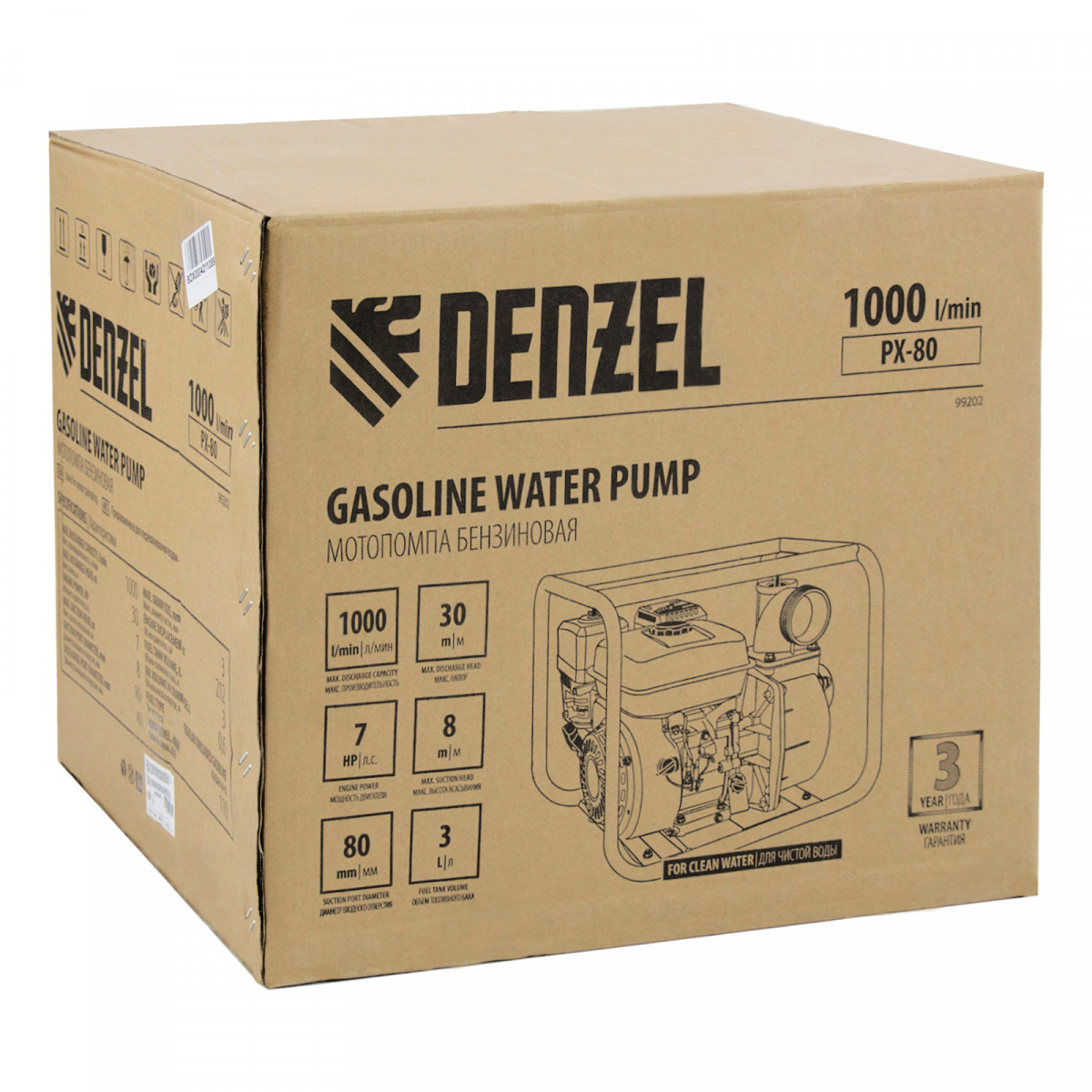 Мотопомпа бензиновая для чистой воды PX-80, 7 л.с, 3", 1000 л/мин, глубина 8 м, напор 30 м Denzel
