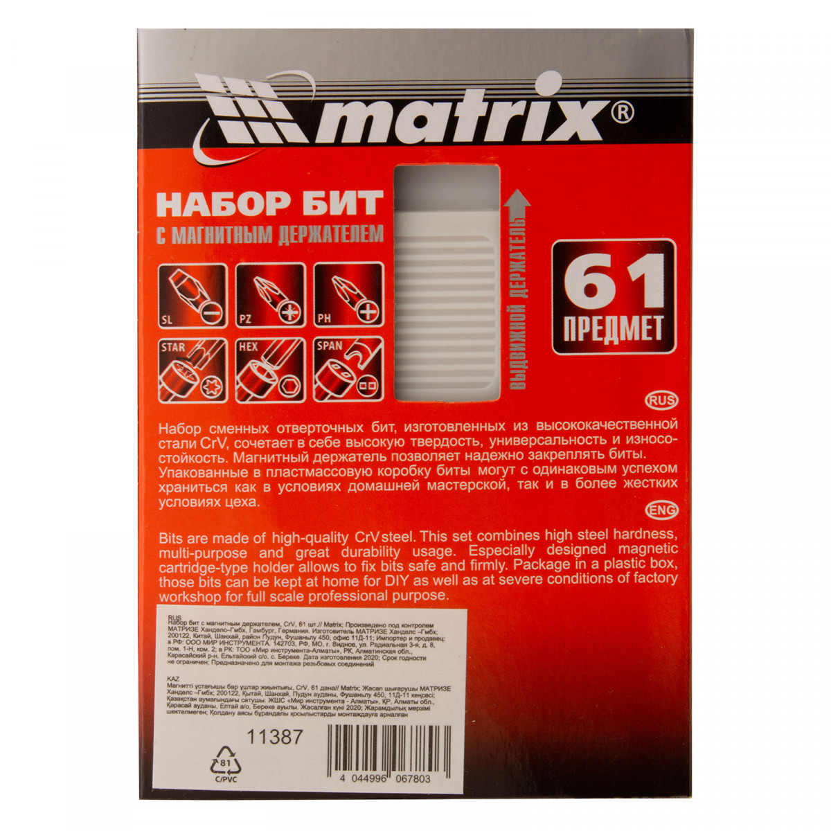 Набор Matrix 11387 состоит из 61 предмета: 60 бит из стали CrV и магнитного держателя. Включает сразу несколько типоразмеров бит длиной 25 мм: SL калибров 3, 4, 5, 5,5, 6, 7, 8, PZ и PH № 0-3, HEX № 1,5, 1,5, 2, 2,5, 3, 3,5, 4, 4,5, 5, 5,5, 6, 7, 8, TORX 5, 6, 8, 9, 10, 15, 20, 27, 30, 35, 40, Spanner калибров 4, 6, 8, 10, TORX Tamper 10, 15, 20, 25, 27, 30, 35, HS № 2, 2,5, 3, 4, 5, 6. Насадки используются в качестве оснастки на шуруповертах и реверсивных отвертках, применяются для монтажа и демонтажа резьбовых крепежей.