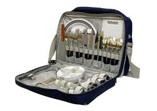 В комплекте: 4 мелкие тарелки, 4 глубокие тарелки, 4 вилки, 4 ложки, 4 ножа, 4 бокала, 4 салфетки, скатерть, солонка, разделочный нож, разделочная доска, штопор, 2 отделения для бутылок, сумка.