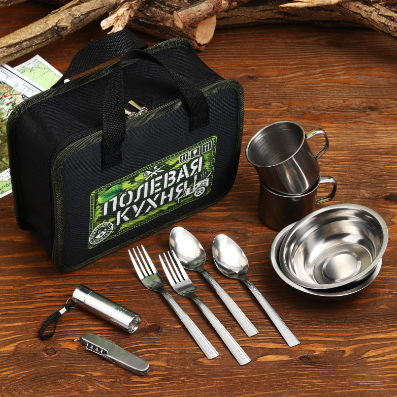 В комплект входят 10 предметов: две тарелки, две кружки, две ложки, две вилки, фонарик и мультитул.