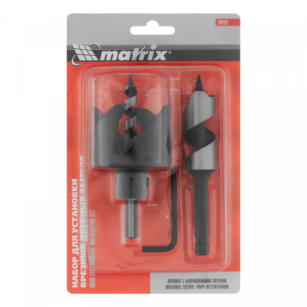 Набор Matrix 70492 включает в себя все необходимое для установки врезных замков: ключ-шестигранник 4 мм, коронку 54 мм с направляющим сверлом и спиральное сверло 22 мм. Используется при монтаже дверей, пригодится как частному мастеру, так и профессионалу.