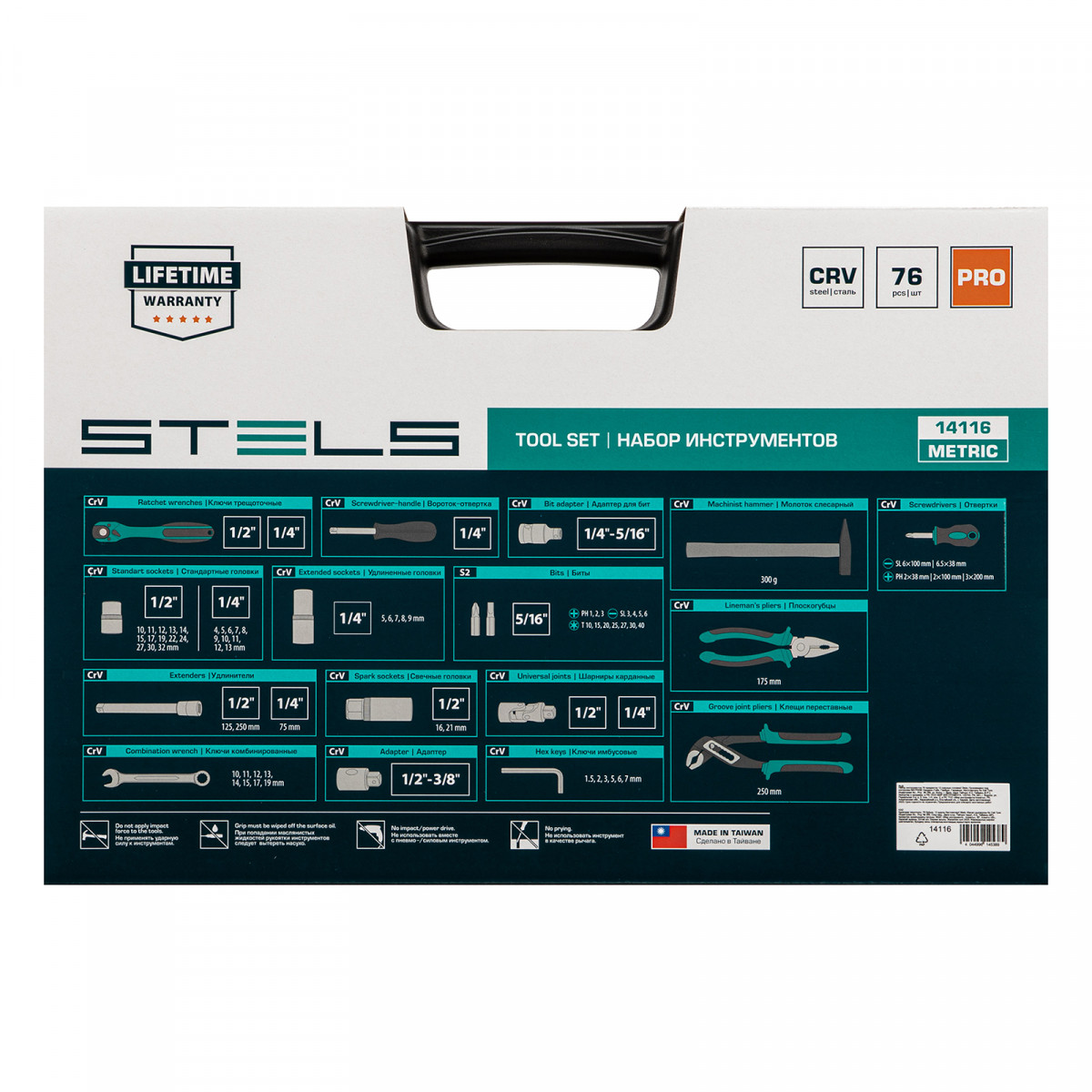 Набор инструментов, 1/2", 1/4", CrV, 12 гранные головки, пластиковый кейс, 76 предметов Stels