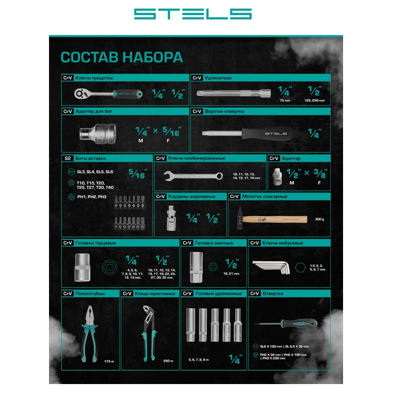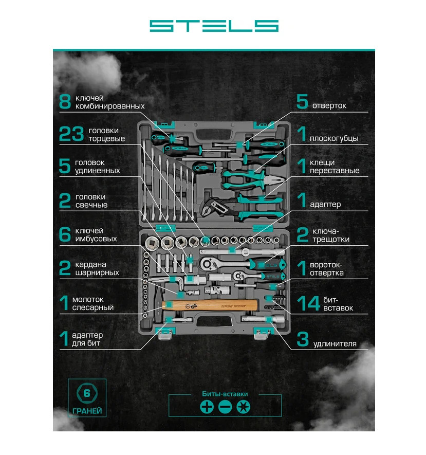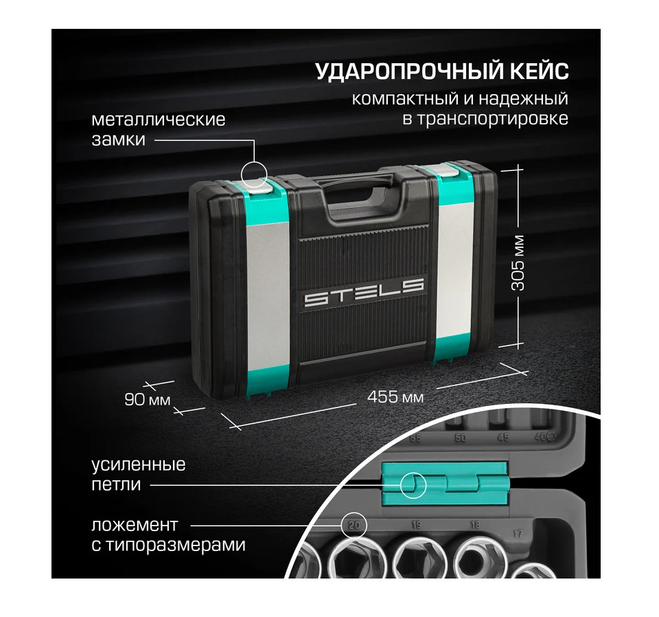 Наборы инструмента торговой марки STELS разработаны специально для автолюбителей и центров технического обслуживания. Каждый этап производства контролируется в соответствии с международными стандартами. Головки и комбинированные ключи изготовлены из хромованадиевой стали, придающей инструменту исключительную твердость в сочетании с легкостью. Биты, биты-вставки и отвёртки производятся из стали S2, улучшающей свойства инструмента. Все наборы упакованы в кейс, изготовленный из жесткого противоударного пластика, с металлическими застёжками. Наборы инструмента STELS пригодятся вам не только в автомобиле. С их помощью можно проводить бытовой ремонт дома и на даче, ремонт бытовых конструкций и садовой техники. Набор инструментов, 1/2", 1/4", CrV, пластиковый кейс 76 предм.// STELS