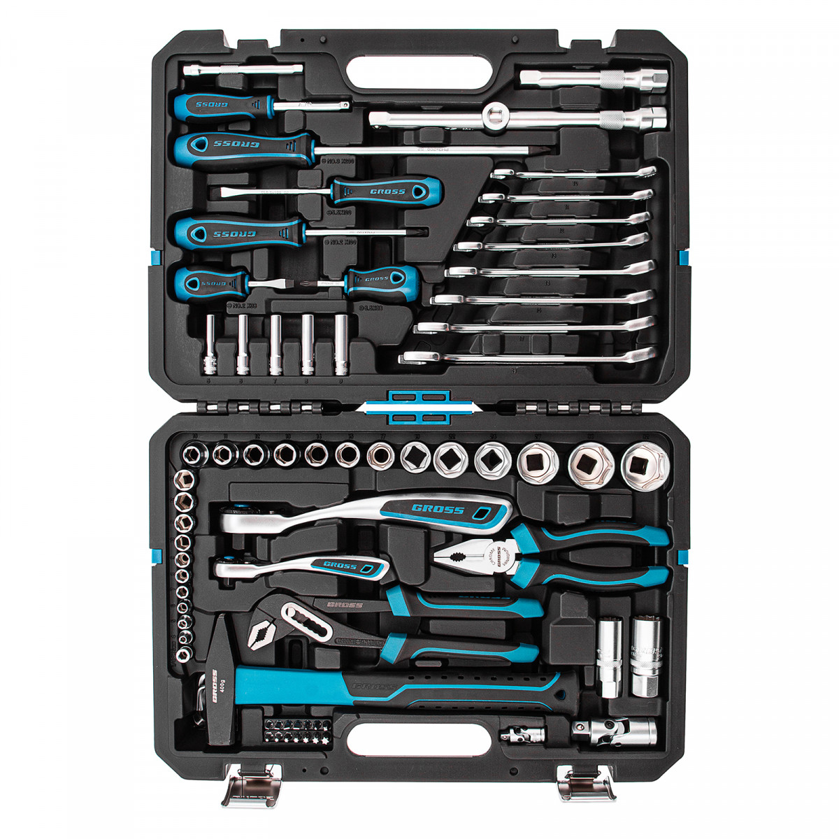 Набор инструментов Gross 14156 включает в себя 76 предметов, в том числе ключи-трещотки со 120 зубьями из стали CrV, с присоединительным размером 1/4" и 1/2". В комплекте инструменты для монтажа и демонтажа резьбовых соединений, молоток для ударных работ, а также переставные клещи и пассатижи, использующиеся для захвата и удержания деталей. Удлинители и карданные шарниры облегчают работу в ограниченном пространстве. Набор пригодится водителям, сотрудникам автосервисов, а также домашним мастерам.