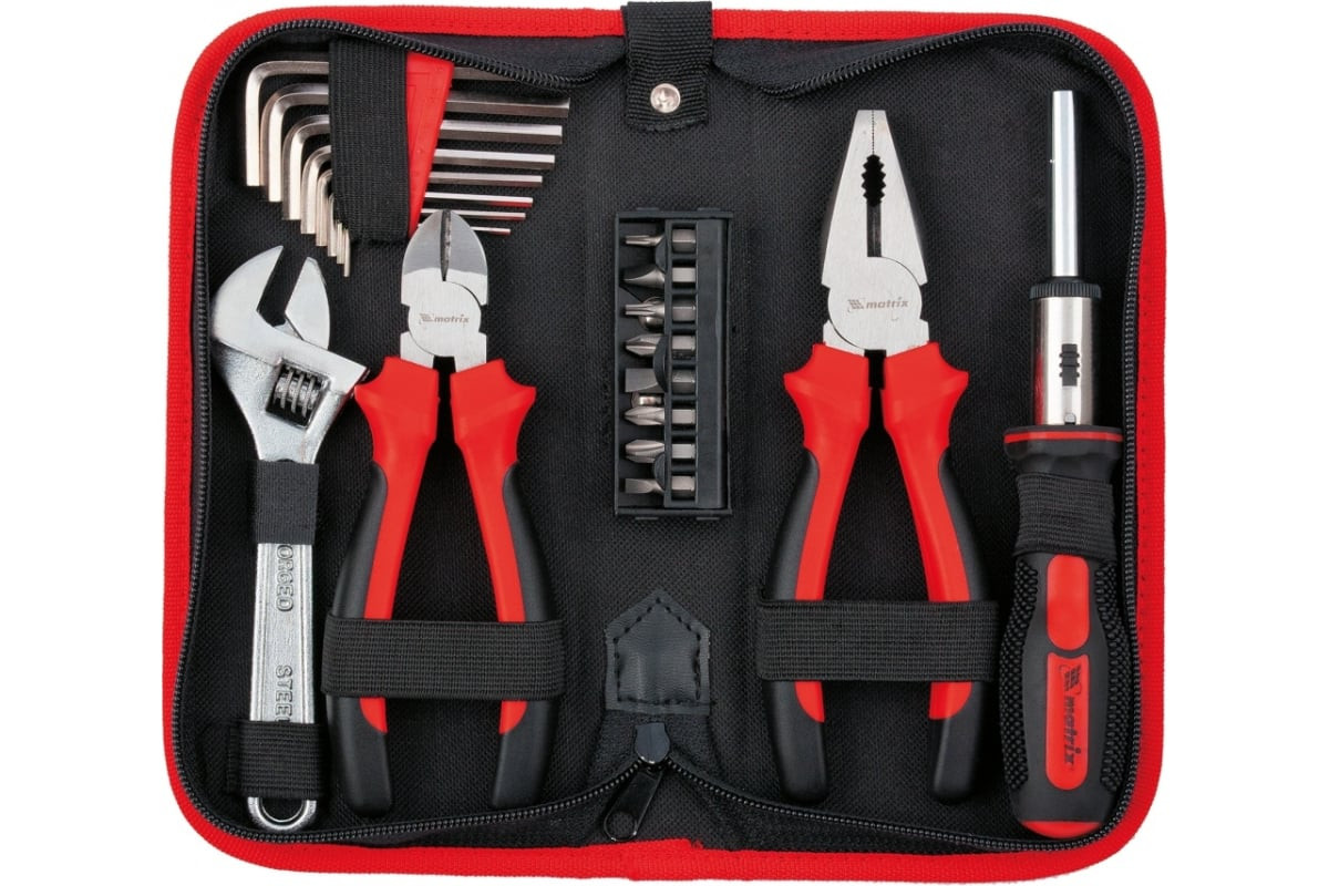 Универсальный набор содержит ключи-шестигранники для удобства работы в труднодоступных местах, разводной ключ для монтажа/демонтажа болтов и гаек, реверсивную отвертку с битами и переходником для работы с крепежными элементами, бокорезы и плоскогубцы для зажима и сгибания заготовок.